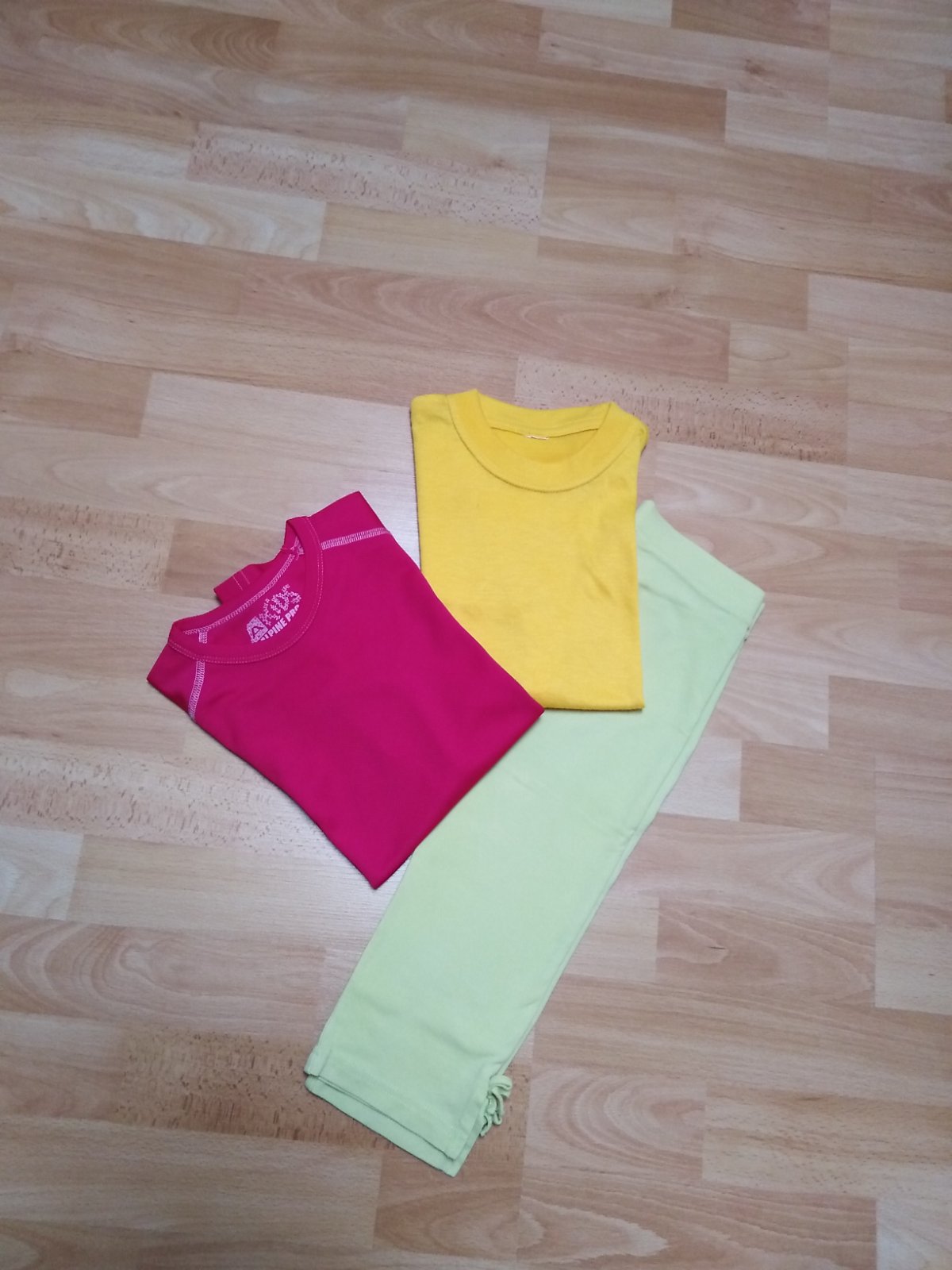 Dvě trička s kr.rukávem + kraťasy vel.128.Cena celkem 60kč.