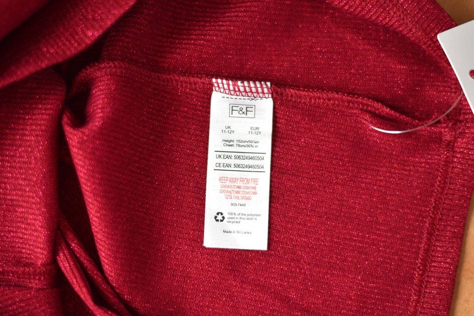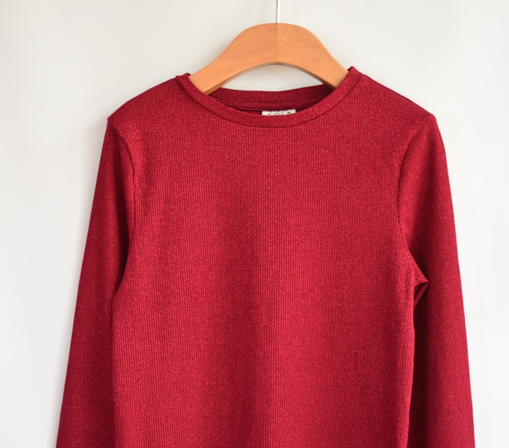 Tm. červené úpletové tričko, protkané lesklou nití.