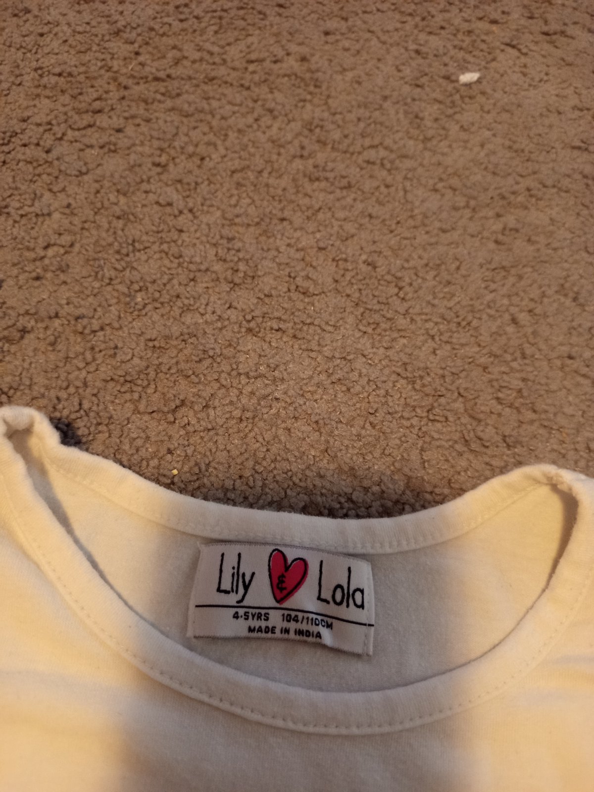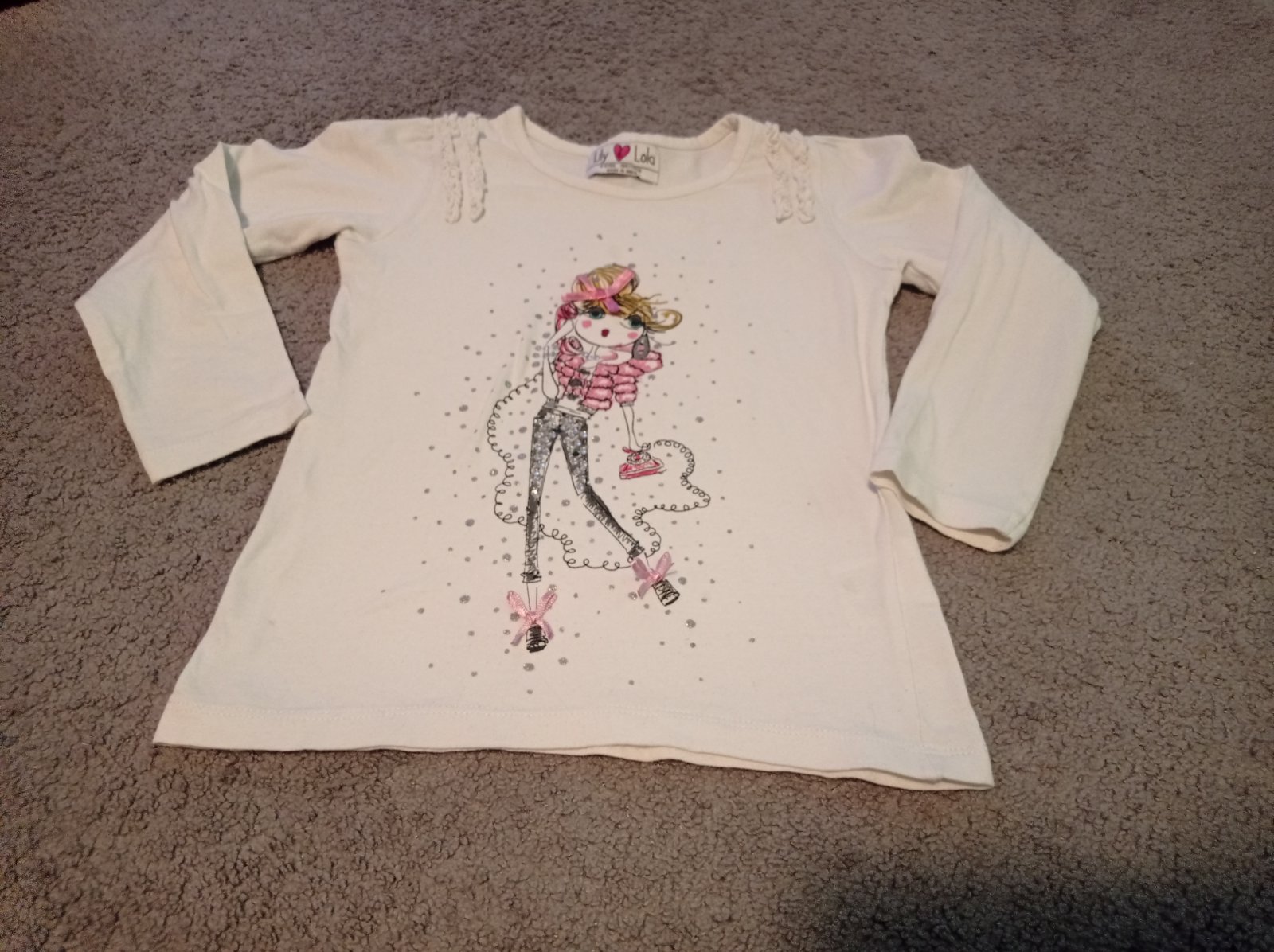 pekne, bile tricko zn. Pepco vel. 104 - s ozdobne obsitym prukrcnikem . s obrazkem holcicky, s napisem a nasitymi strapci. 100% bavlna, pouzite - koupila jsem za 50kc, ale bylo pro nas male