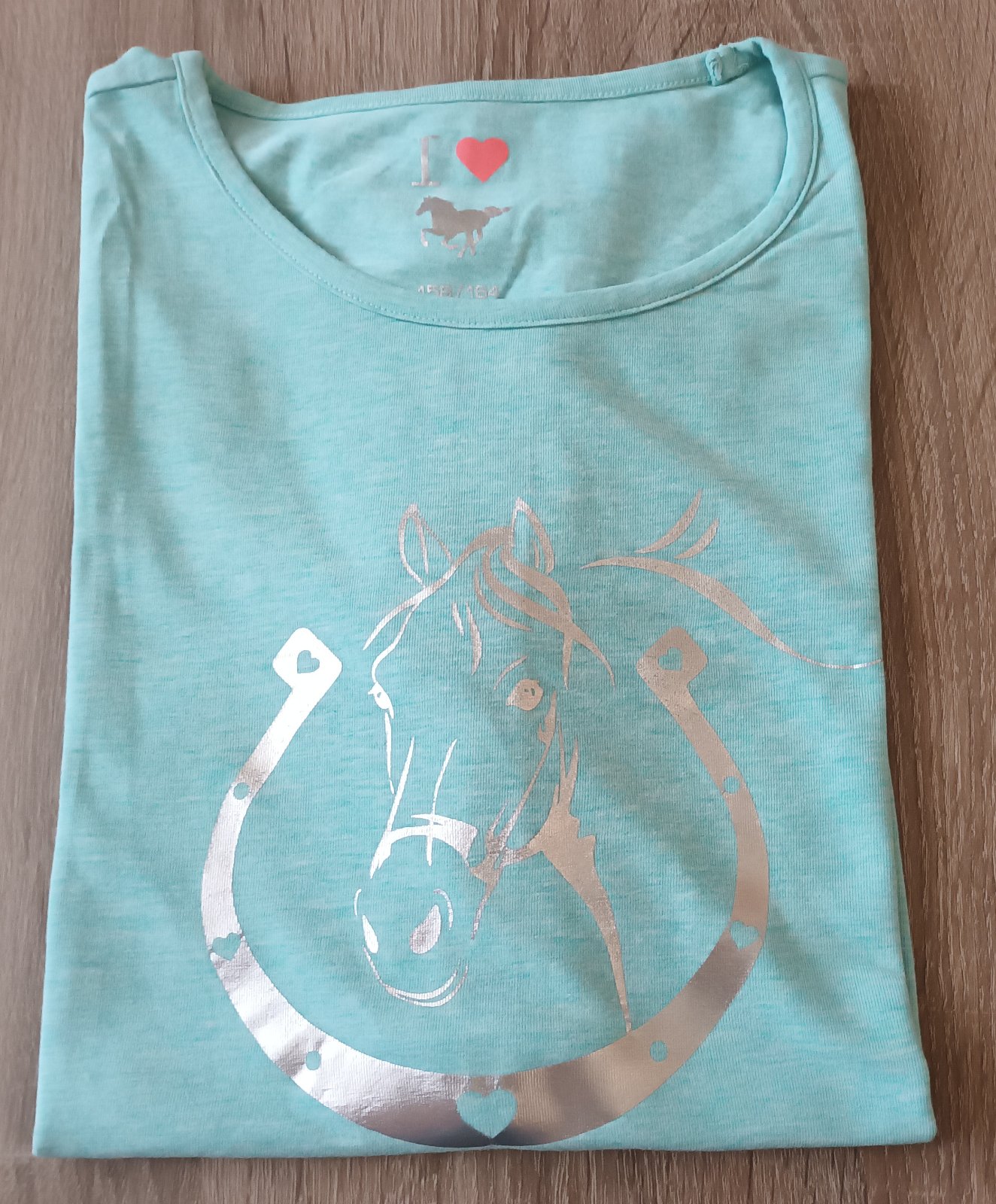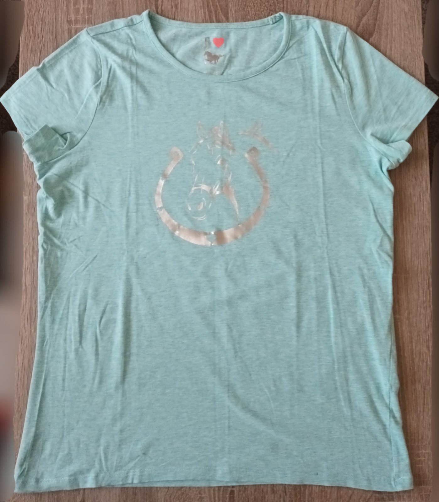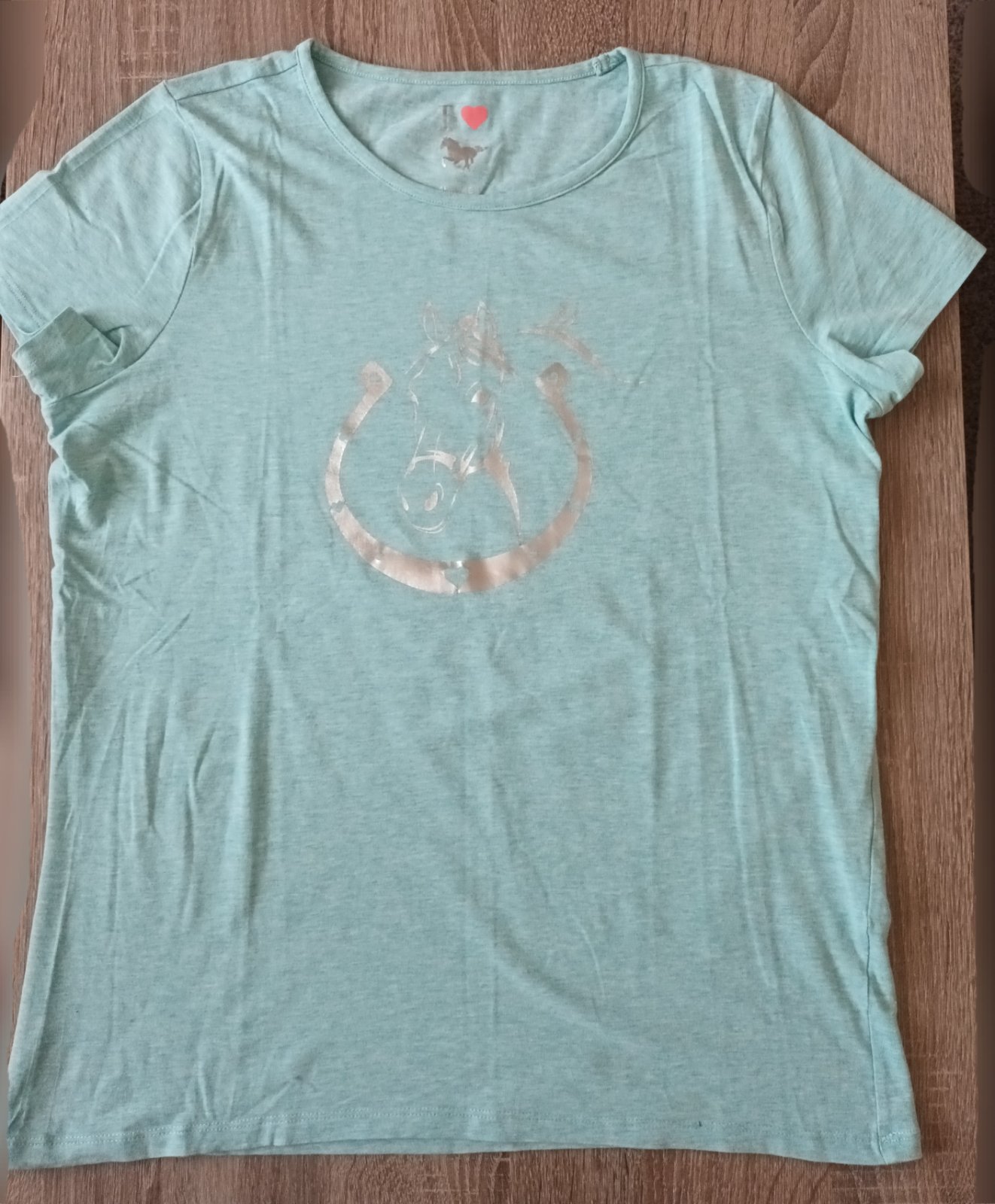 Dívčí triko zelenkavé krátký rukáv kůň Tchibo , vel.158/164. Triko je šetřené , bez vad.