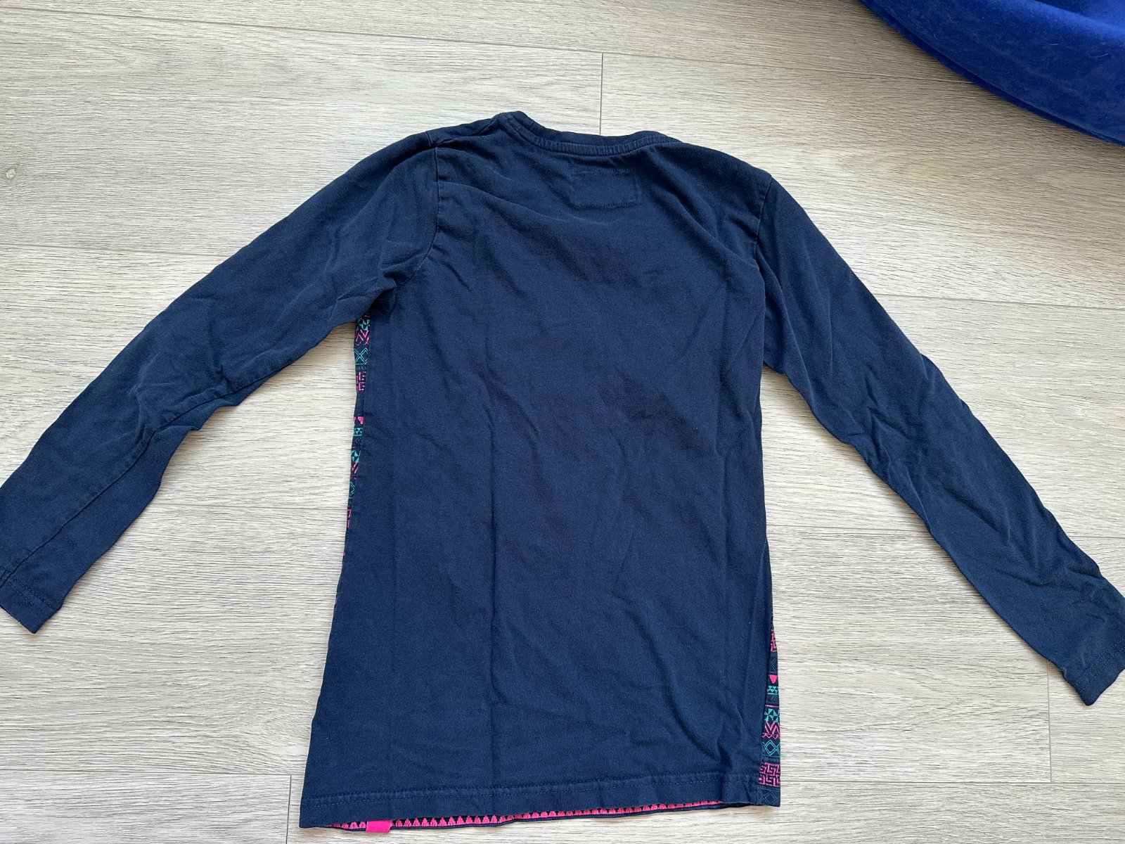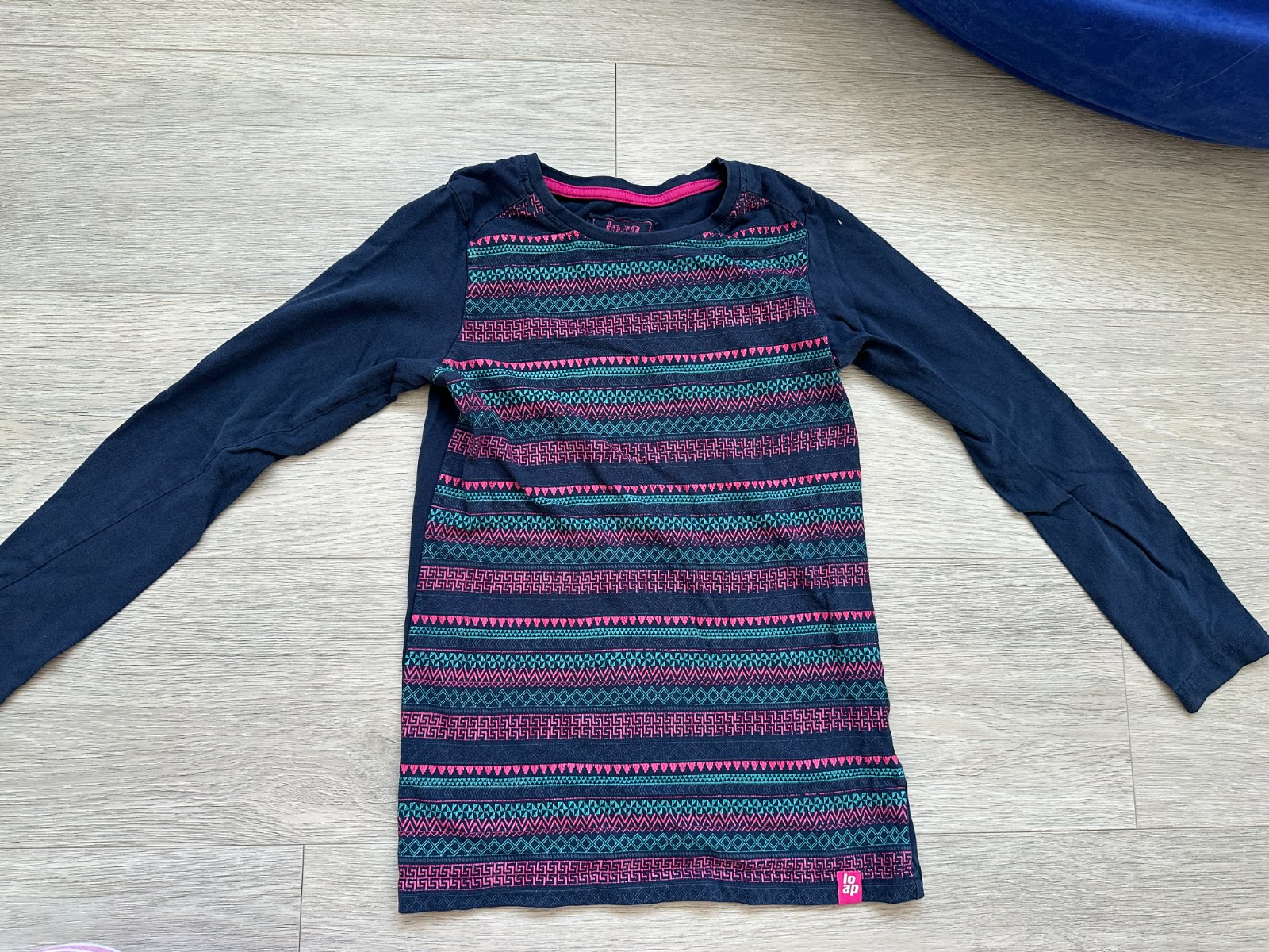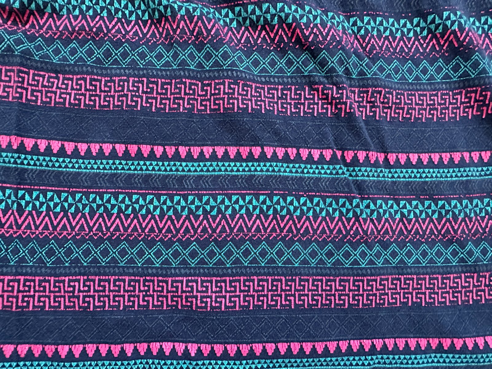 - tmavě modré tričko s růžovými a modrými ornamenty