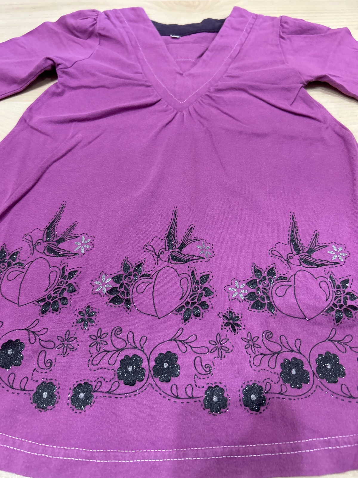 Tričko má prací chloupek, jinak bez vad a fleků. Na rukávy jsem našila náplety, takže vydrží dvě vělikosti (116 - 122), navíc se rukávy nenamáčí v jídle/barvičkách atd. Uvedená velikost 6-7 let.