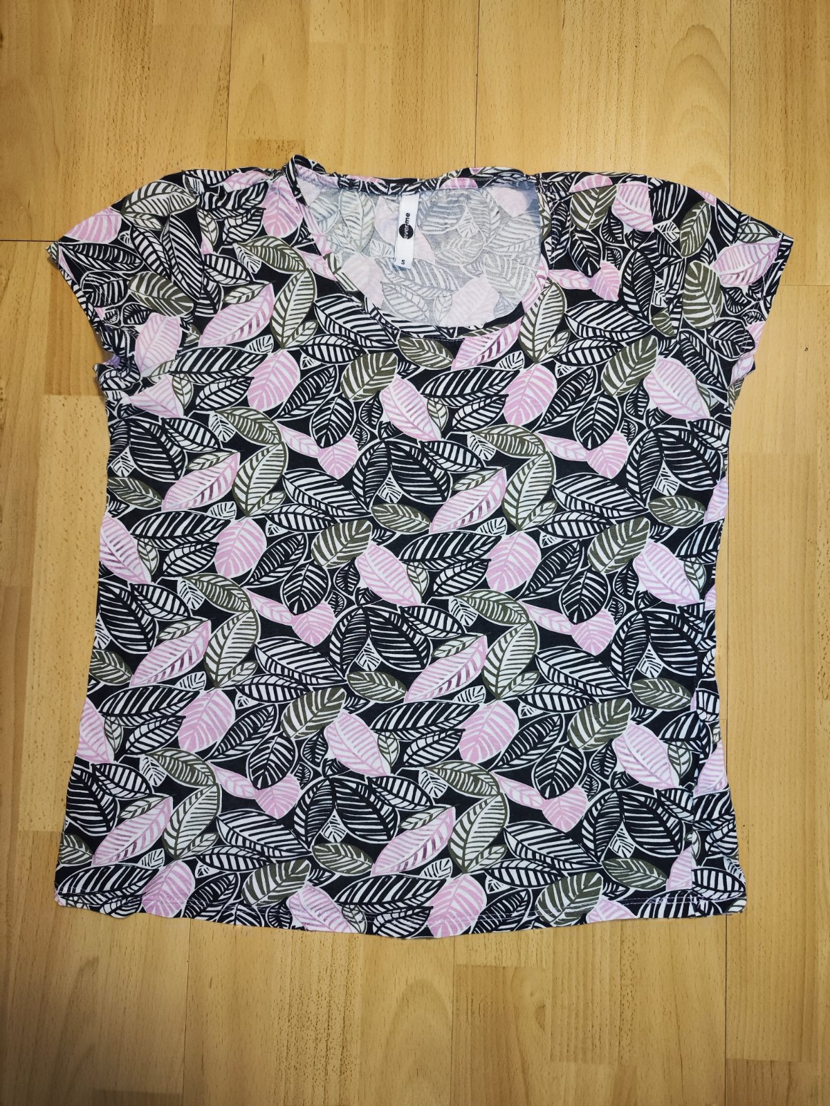 Prodám triko s krátkým rukávem, značka Ever.me, velikost S. Rozměry – délka od ramen 57, 5 cm; šířka v podpaží 47 cm. Triko má černý podklad s výrazným listovým vzorem v růžové, bílé a zelené barvě. Triko je ze 100% bavlny. Cena 70 Kč, v Brně možné osobní předání.