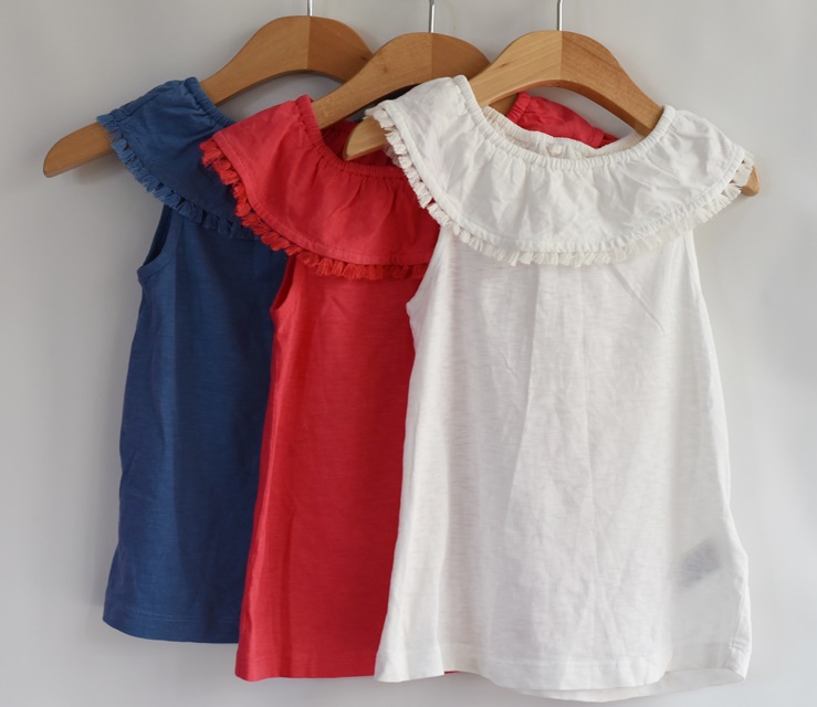 Modrý, červený, bílé tílko vel. 2 - 3 roky.