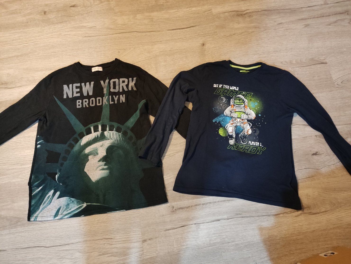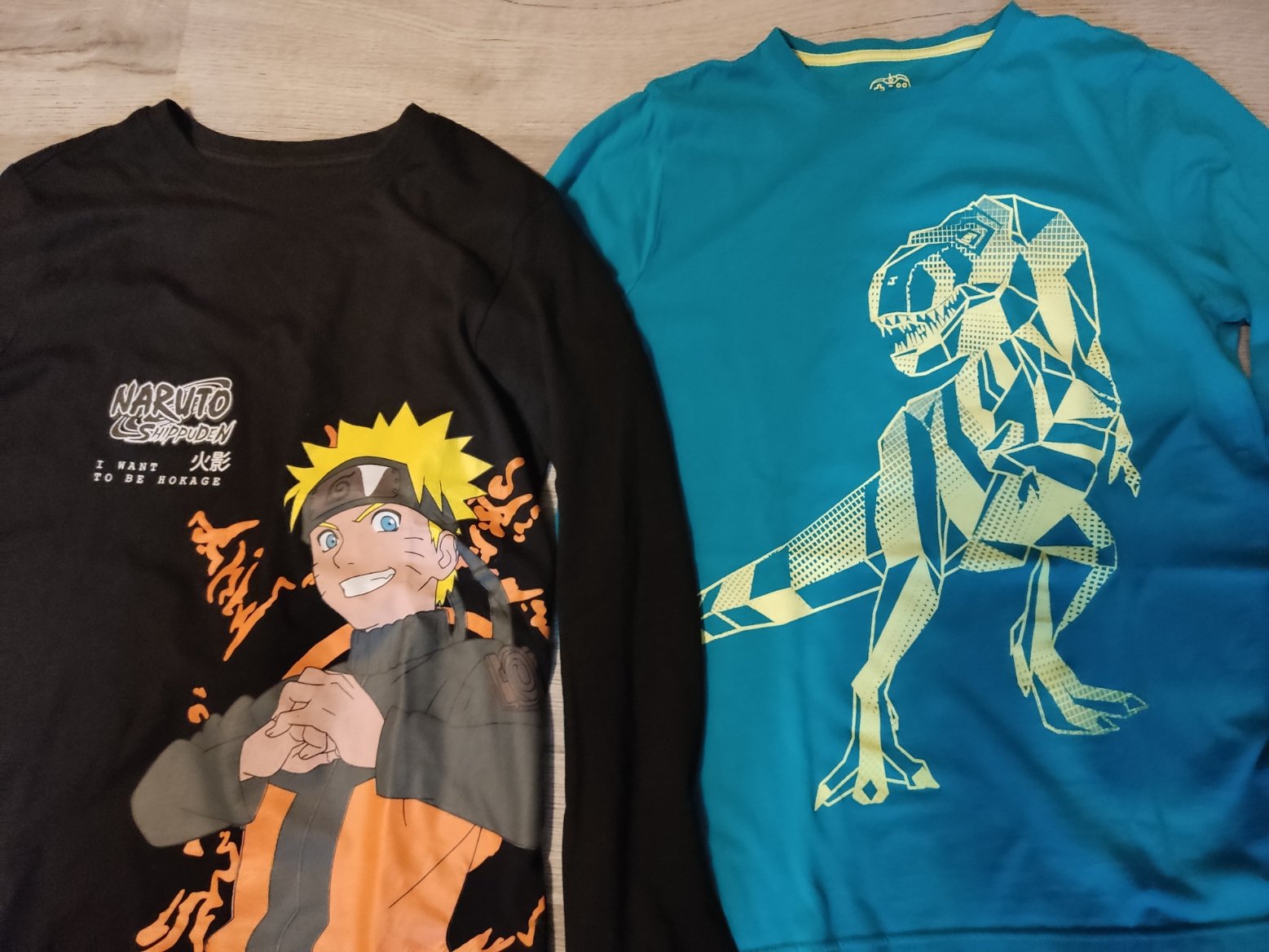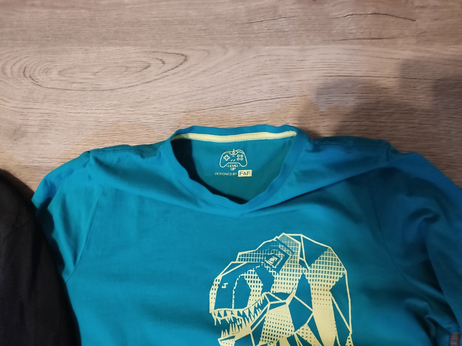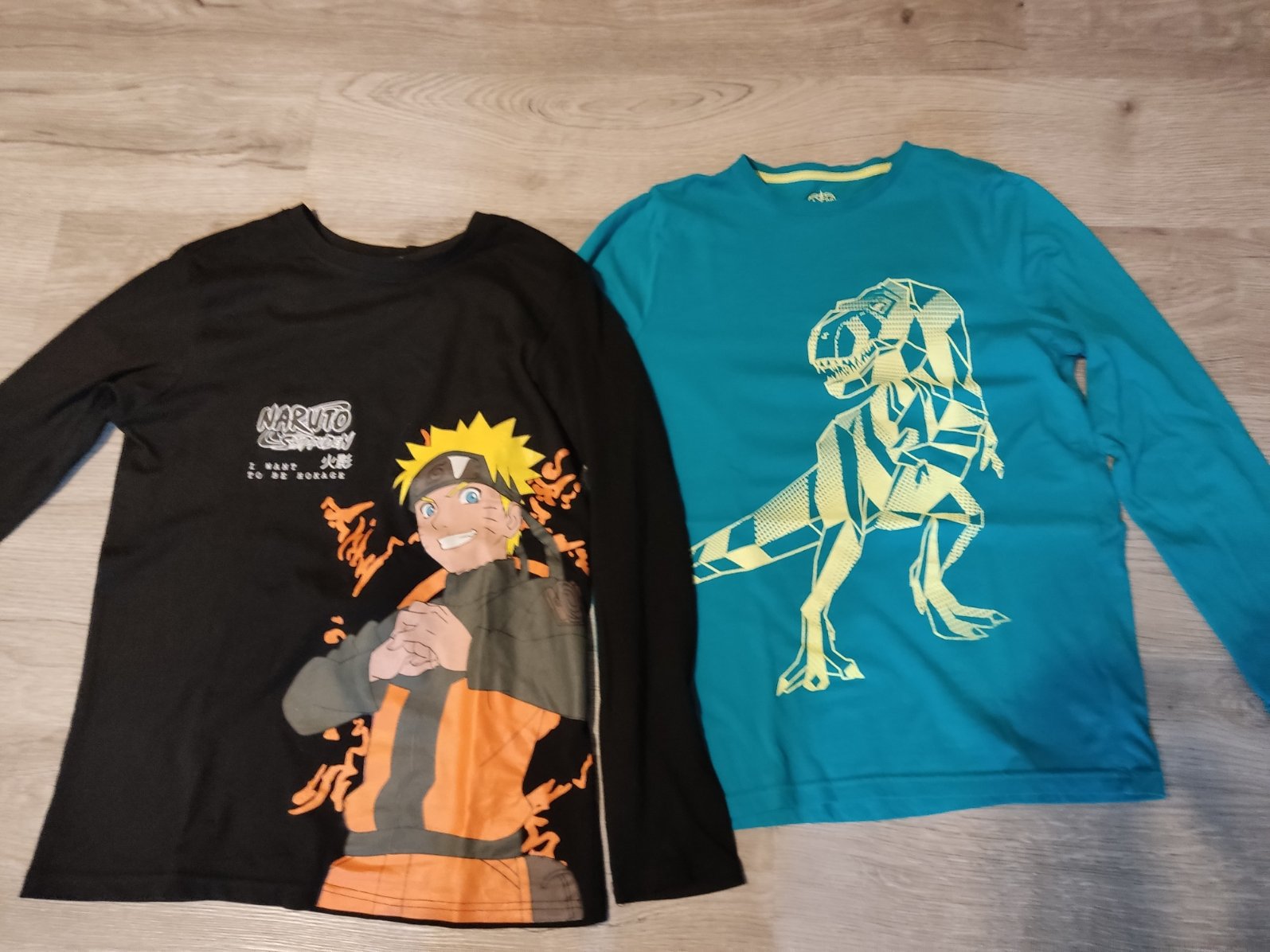 trika dvě na fotce zlené s dinosaurem vel 13 let FaF, černé s obrázkem z Takka nové bez visačky vel 170,- obě 150,-