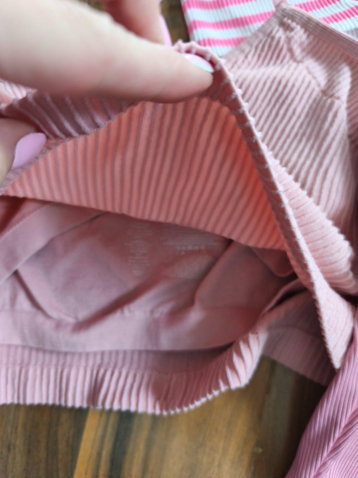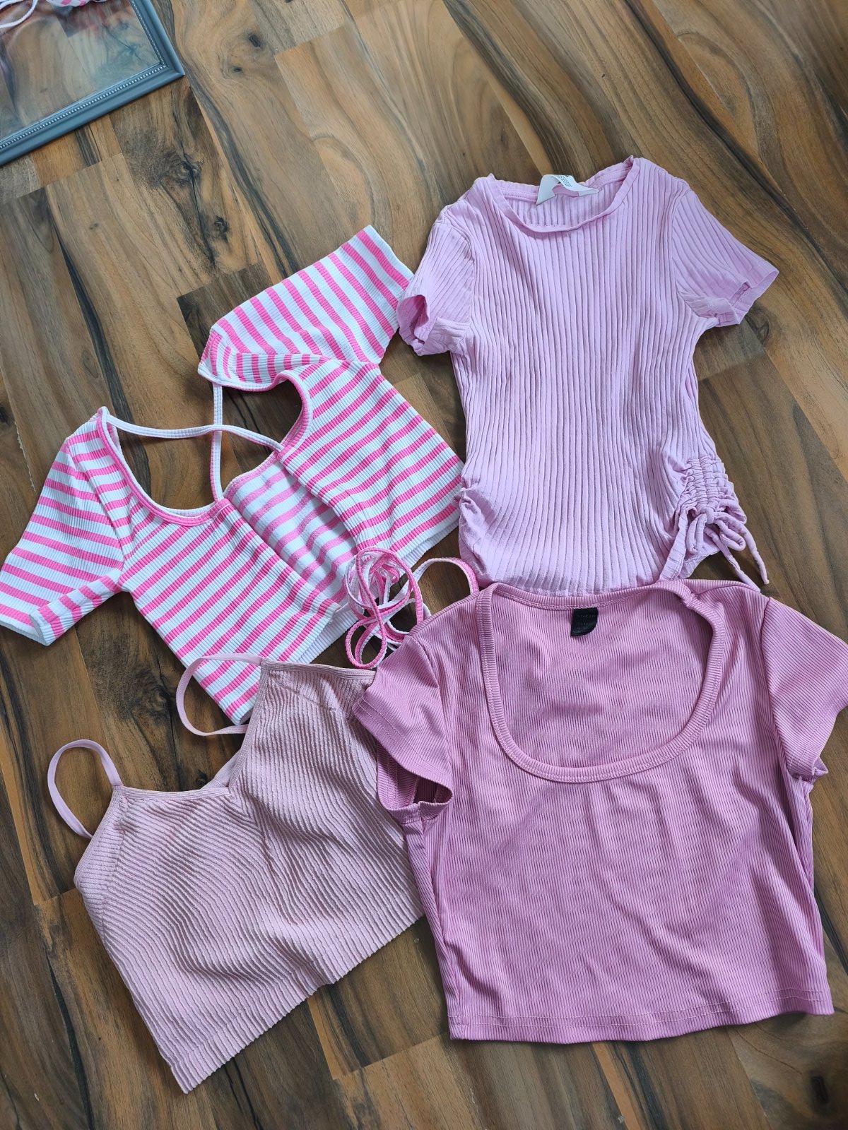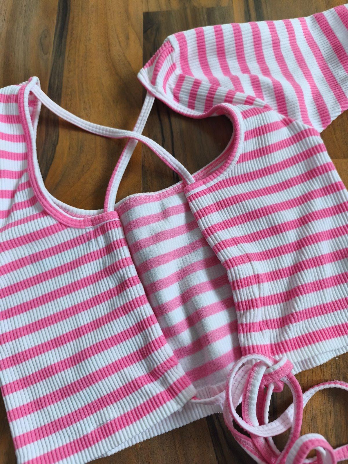 4krát crop top - triko - tílko různých značek a velikostí, dcera nosila při XXS/XS. Cena za vše, při koupi zvlášť: pruhované s vázáním Dunnes jednou vzaté 170, sametový žebrovaný top s všitou podprsenkou 80, triko s řasením po straně 70, obyč žebrované tričko má uvnitř flíčky, ještě zkusím vyprat 50 Kč.