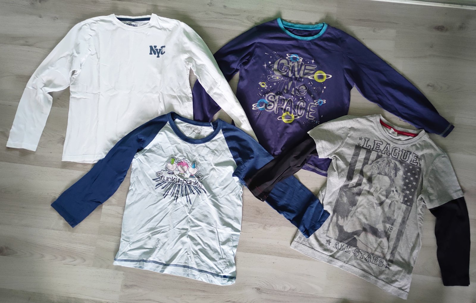 Mix triček nošených na doma, vel. 140-146. Délka 50-51 cm. Bez děr, šedé má vyšisovaný obrázek, světle modré pár flíčků.