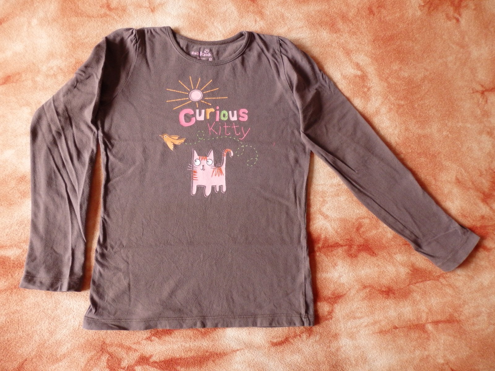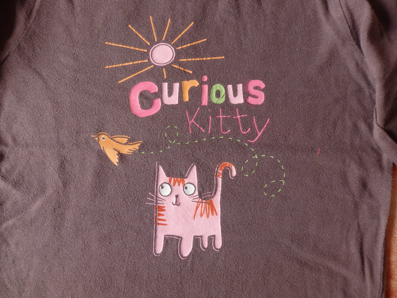 Pěkné hnědé tričko s kočičkou a ptáčkem, v dobrém stavu.