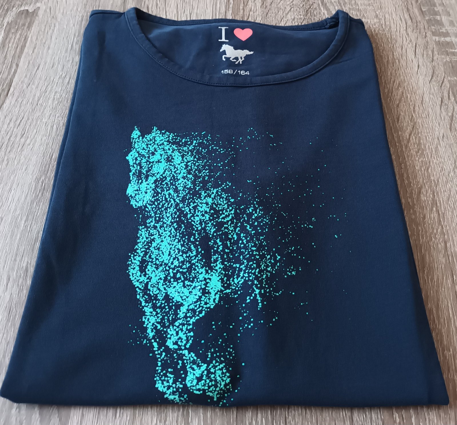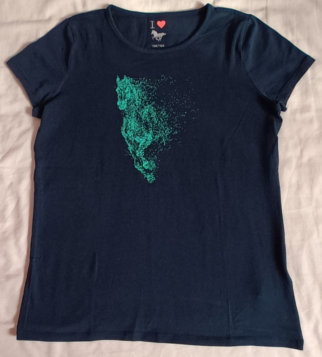 Dívčí triko tmavě modré krátký rukáv s aplikací koně Tchibo , vel.158/164. Triko je šetřené , bez vad!