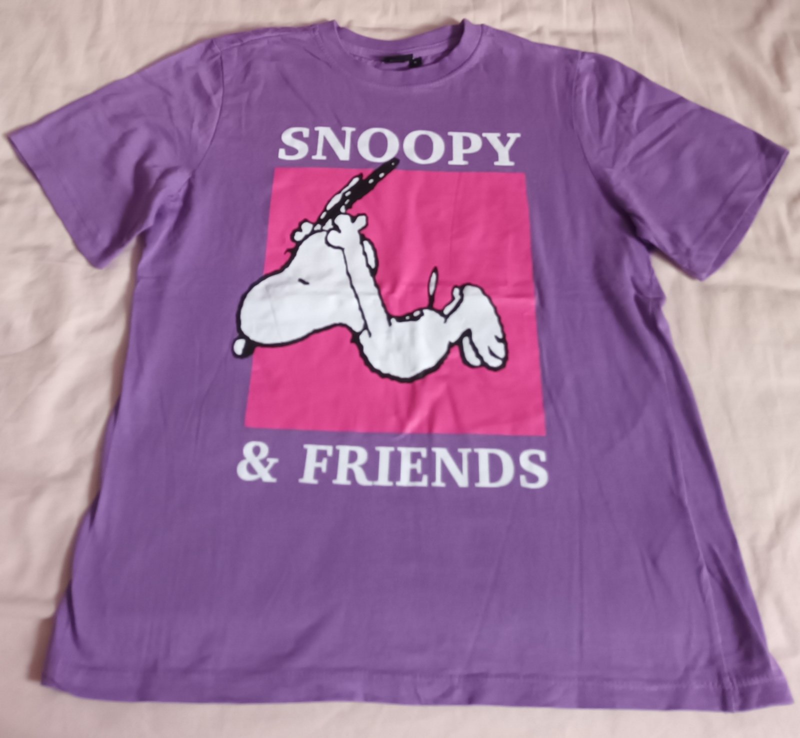 Dívčí triko fialové Snoopy krátký rukáv Takko, vel. S. Triko je nošeno svátečně, na PD dole pidi flíčky(viz.det.foto) není téměř vidět.