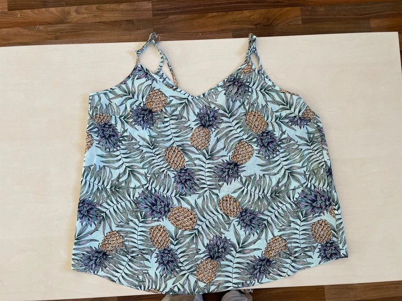 2942. nabízím k prodeji tento lehký letní top s ananasem, vel 46/18 tedy cca XXXL, Primark. Materiál jako šifonový se zrnitou strukturou - neuvedeno, ale bude asi polyester. Nepruží. Nošen, bez vad, krásnýRozměrydélka 60prsa 58pas 61
