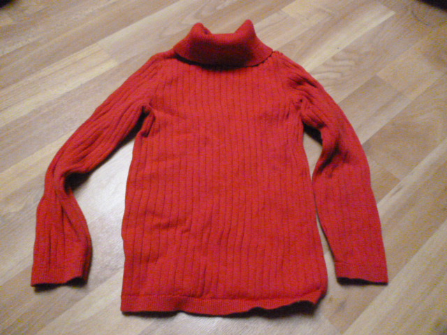 nošený,. pěkný, délka je 44 cm, rukáv od krku je 46 cm, šířka od 2x31-41 cm, pěkný i pod šaty, tmavší červená než na foto, psaná vel. 7-8 zn.George