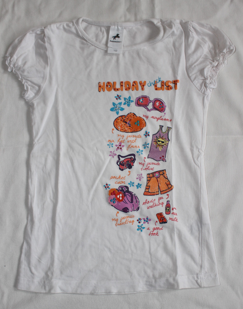 Ve velmi dobrém, bezvadném stavu, veselé letní aplikace zdobené třpytivými detaily, rukávky do jemné gumičky.