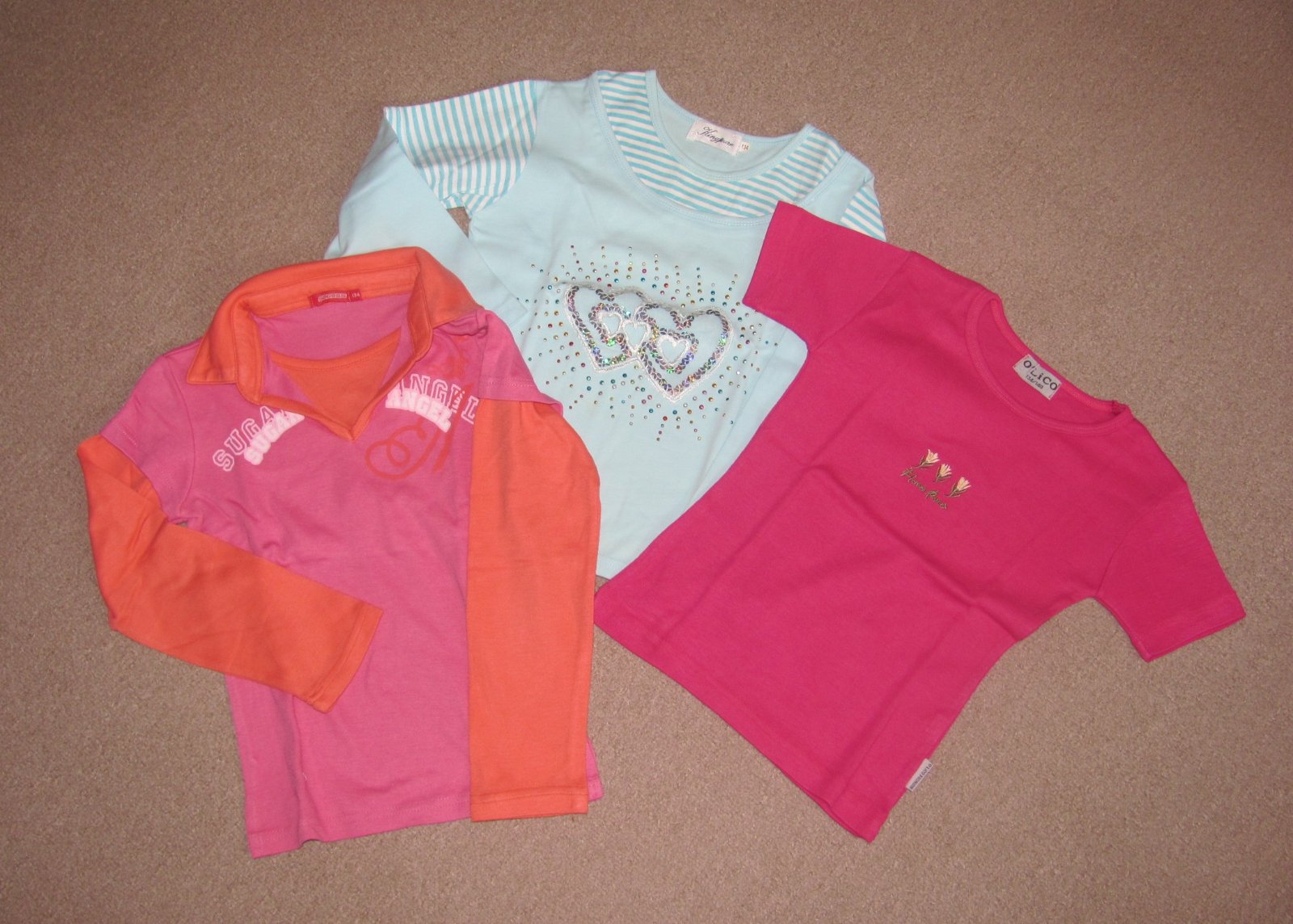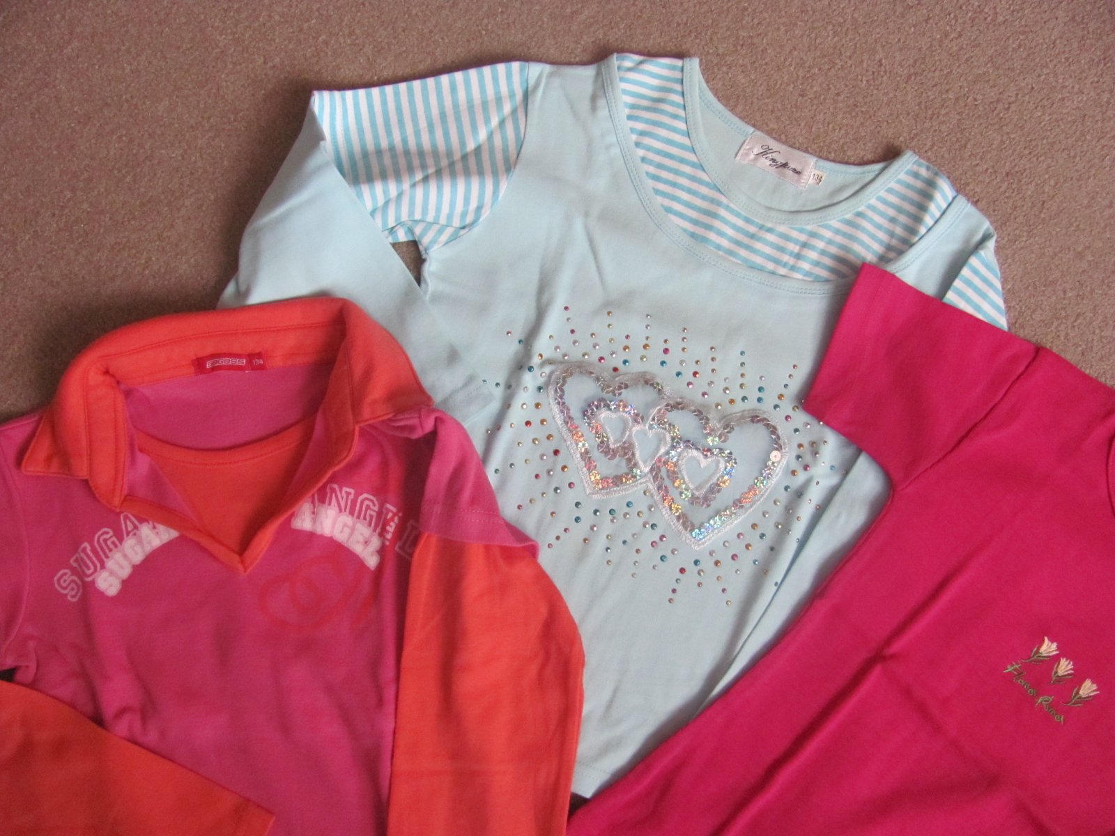 duopak bavlněných triček, obě min. nošené, růžové top stav, modré má pidiflíček na lokti. cena za obě. vel. uvedena 140, dle mne o trochu menší. délka 47 cm, rukáv 49/55cm.