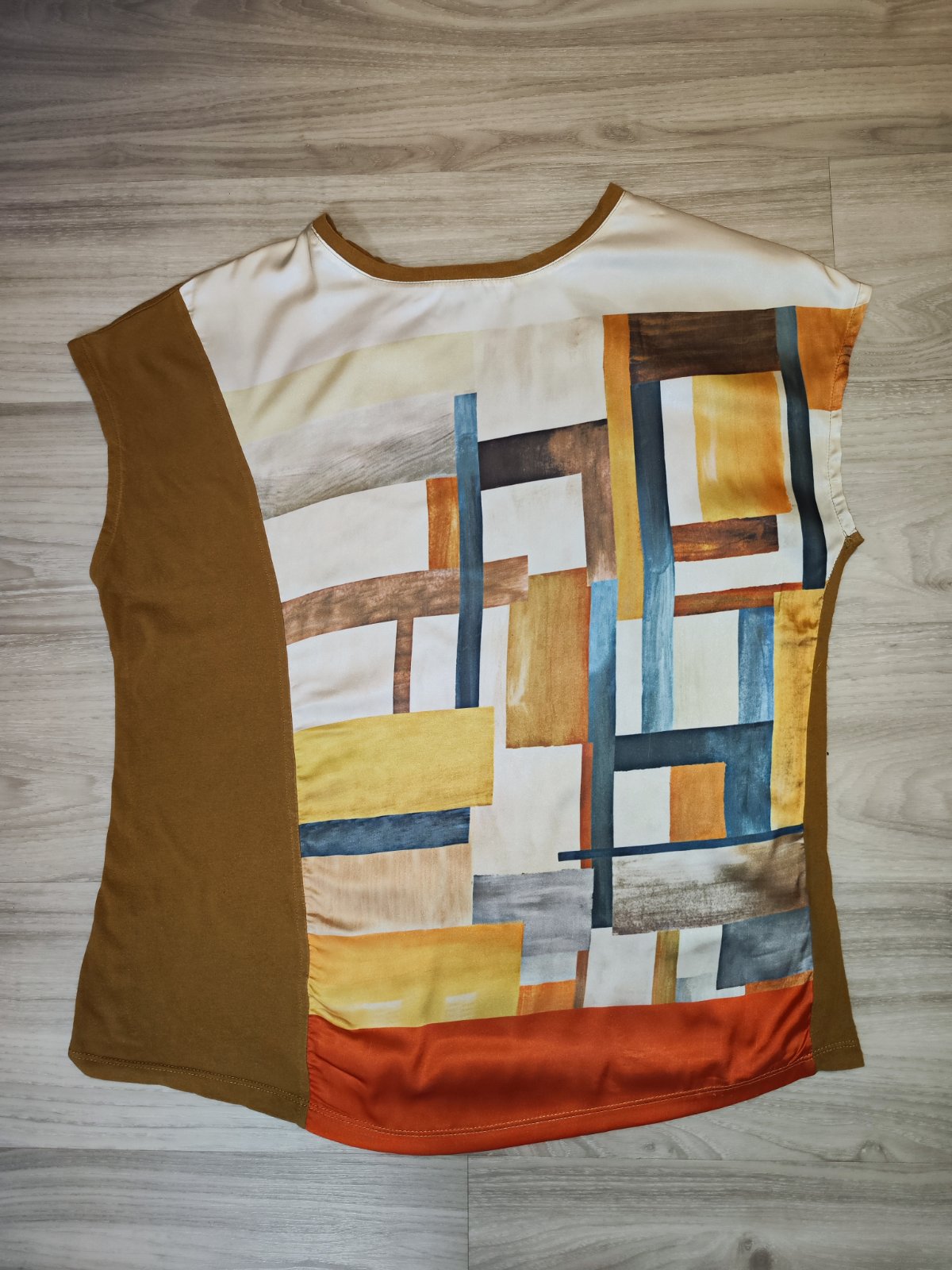 Prodám originální asymetrický top s kombinací hořčicově hnědé a výrazného geometrického vzoru v tónech modré, oranžové, bílé, žluté, hnědé. Značka Spodní lem doplněn kontrastním oranžovým pruhem. Gate Women, velikost L/40, rozměry – délka od ramen 56, 5 cm; šířka v podpaží 54 cm. Materiál bavlna/polyester. Cena 100 Kč, v Brně možné osobní předání.