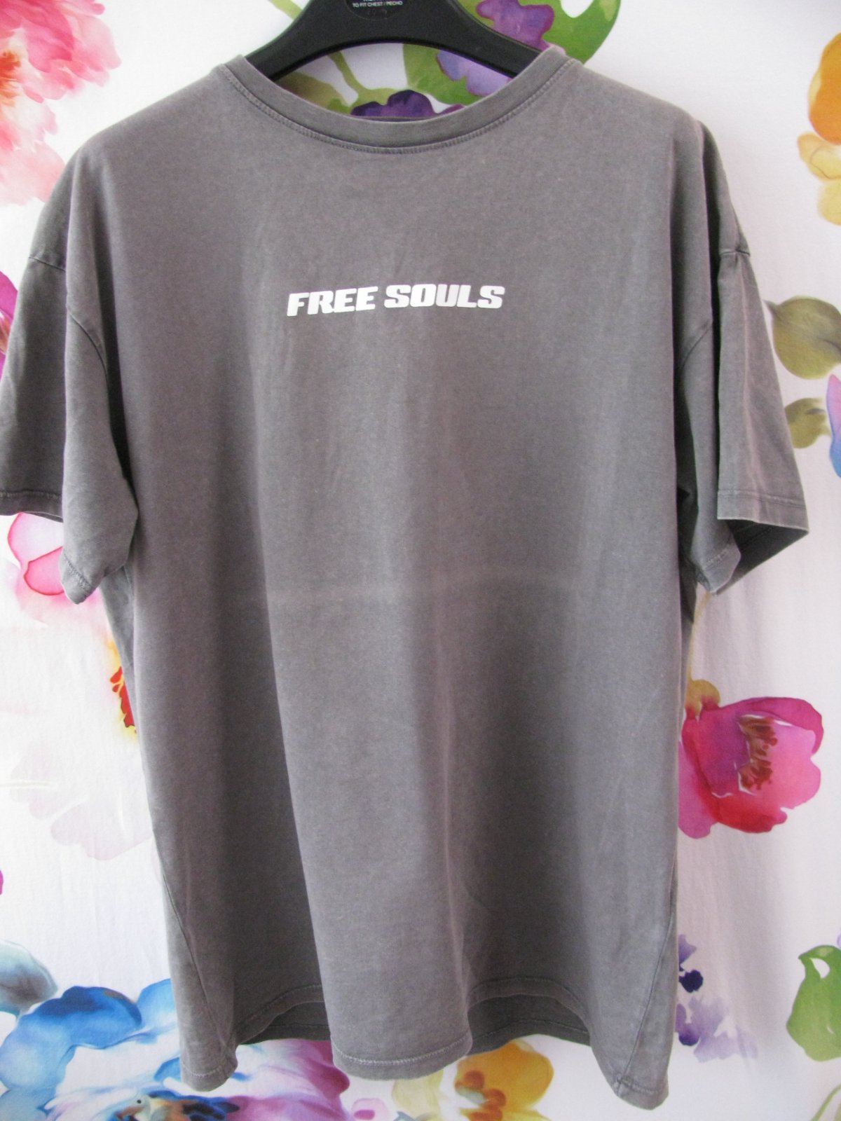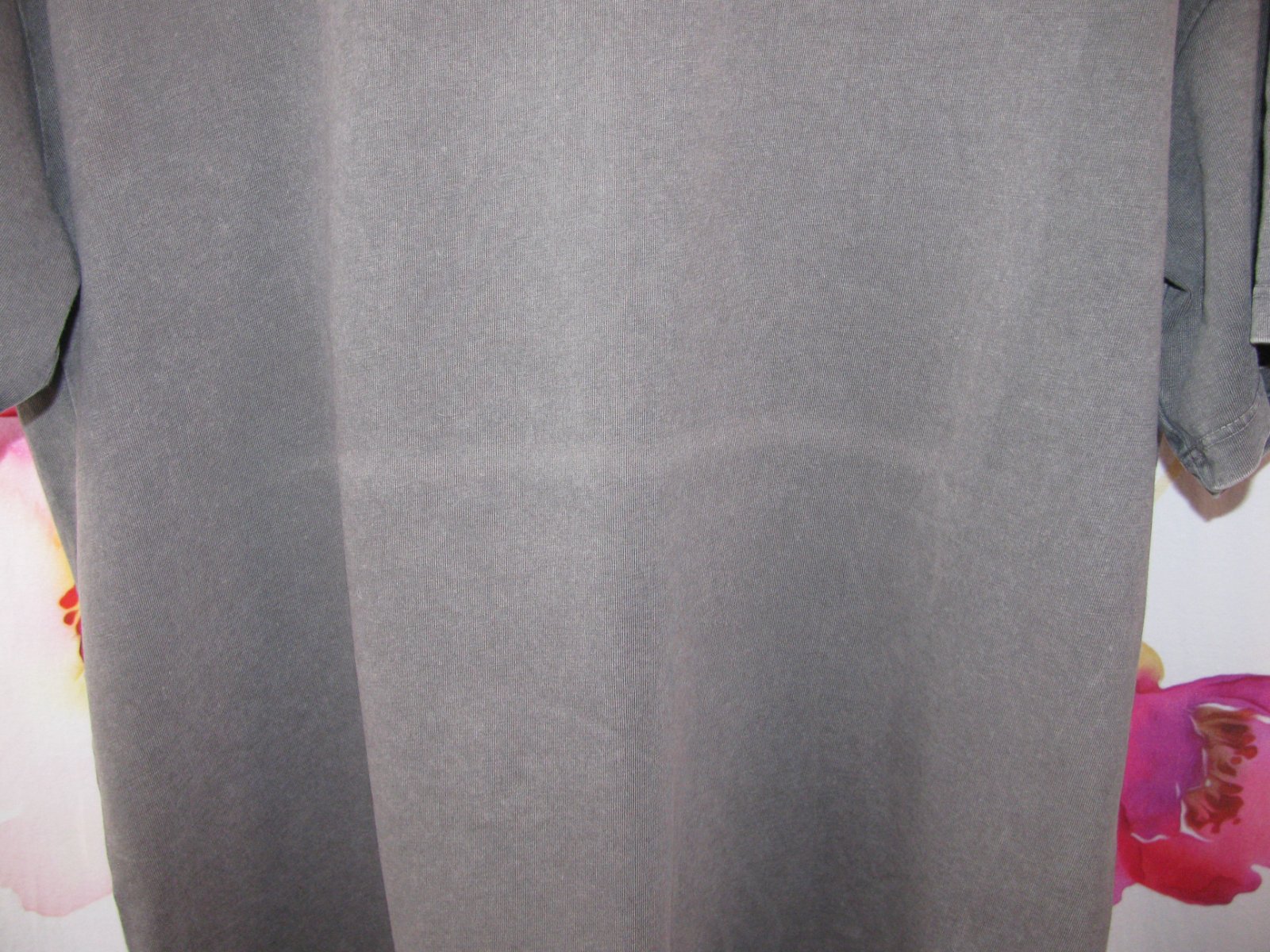 Hezké, šedé bavlněné tričko, s oboustranným potiskem, 100% bavlna. Jediná vada je světlý pruh přes pas od sluníčka-viz foto, jinak bez vady. Zohledněno v ceně, ještě se užije.