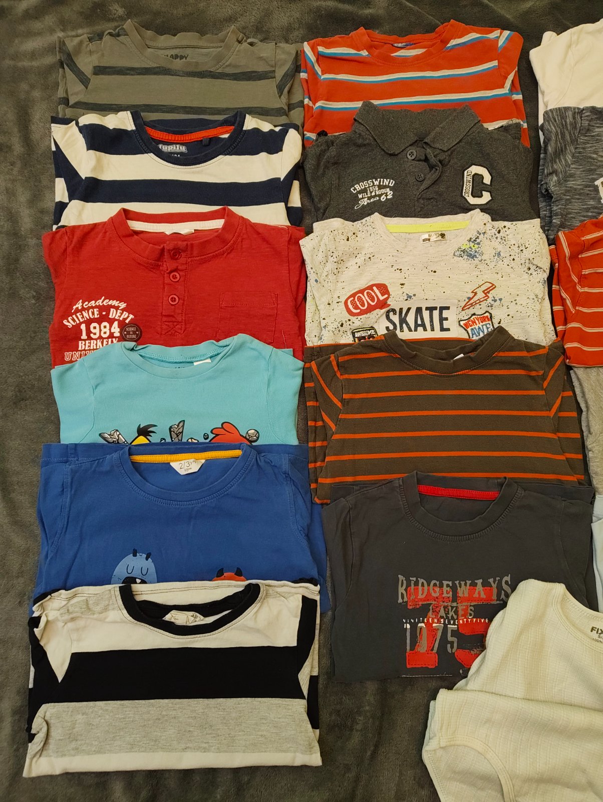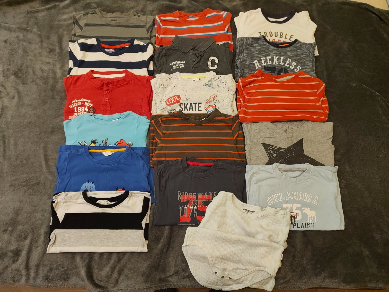 Trička cca 2x oblečené, neunosily jsme :-/ jako nové. Rukáv od krku 40 cm, délka 44 a 45 cm.