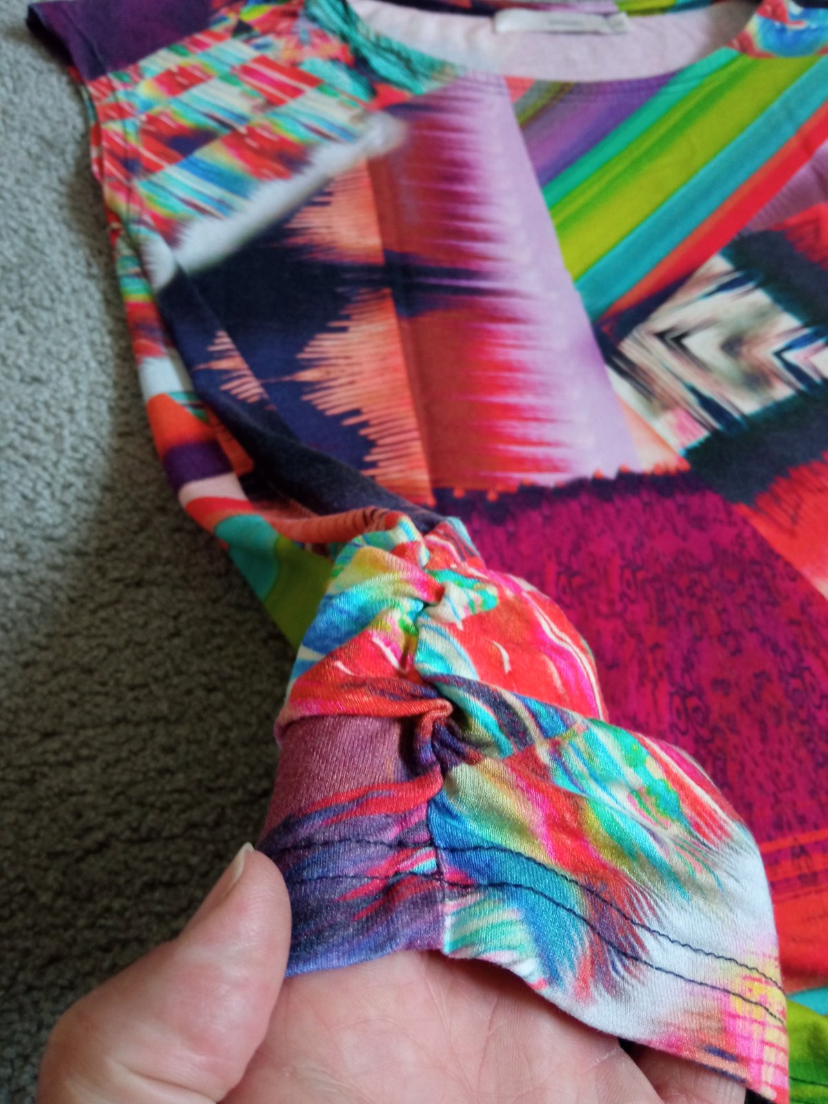 barvy nejsou tak zářivé, spíš trošku vyprané, jinak je tričko super pružné, takže možno nosit i při větší vel., ta je psaná jako M, ale jánosila při XL, dole na bocich řasené- nafoceno...délka 61 cm, šířka pod průramky 2x 45 cm, měřeno v klidu