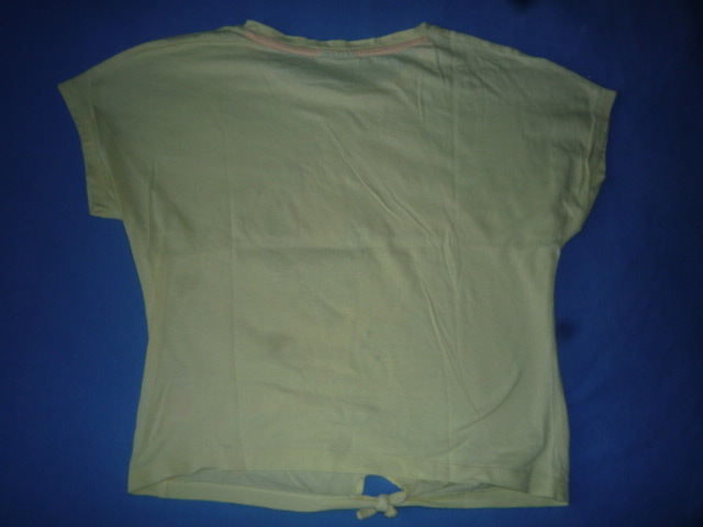 Krásné letní triko do pasu, kde je uzlíček. Aplikace se třpytí. Velkost uvedená 158-164. Dávám ale do menších 146, dá se nosit dřív.