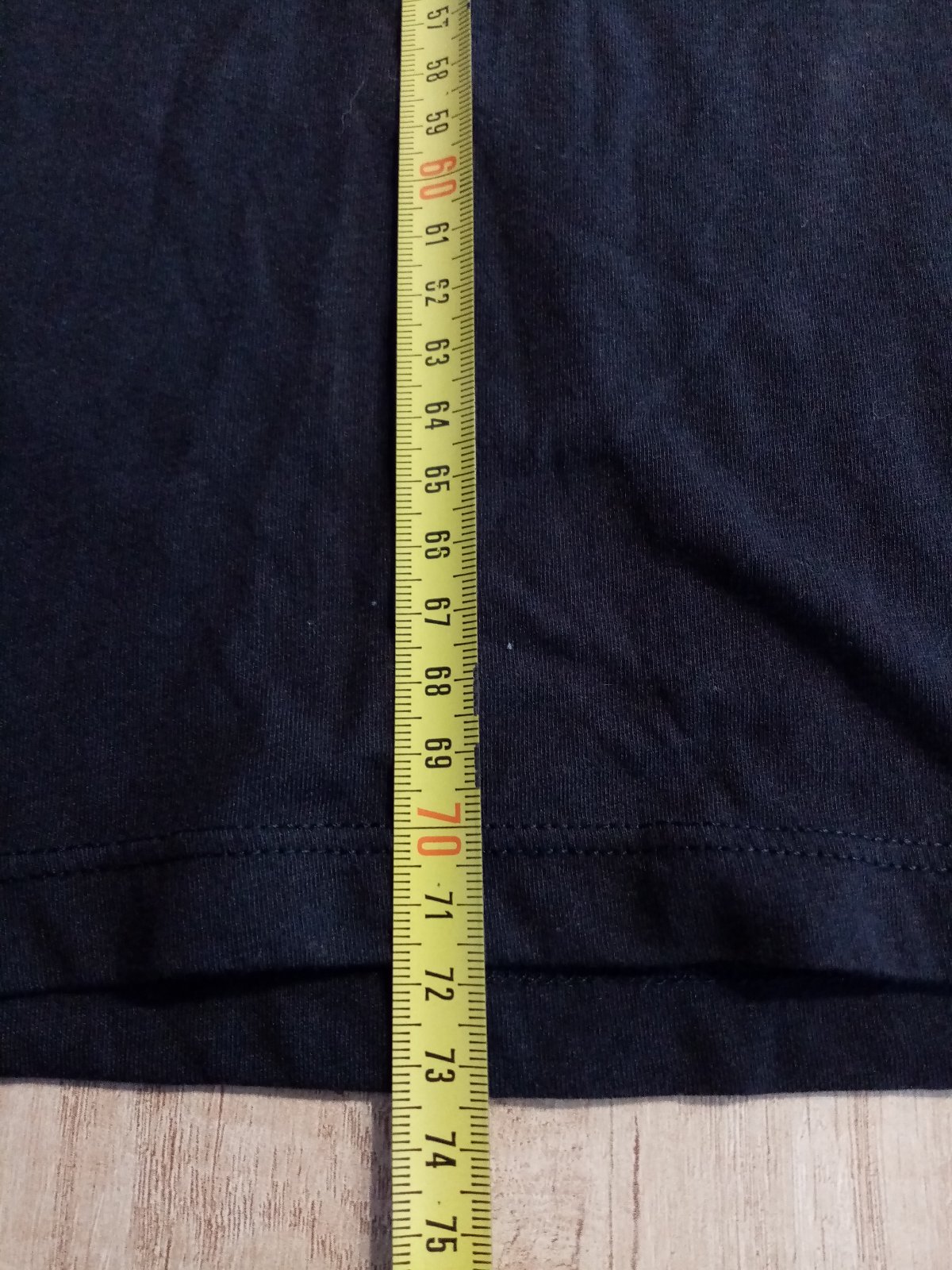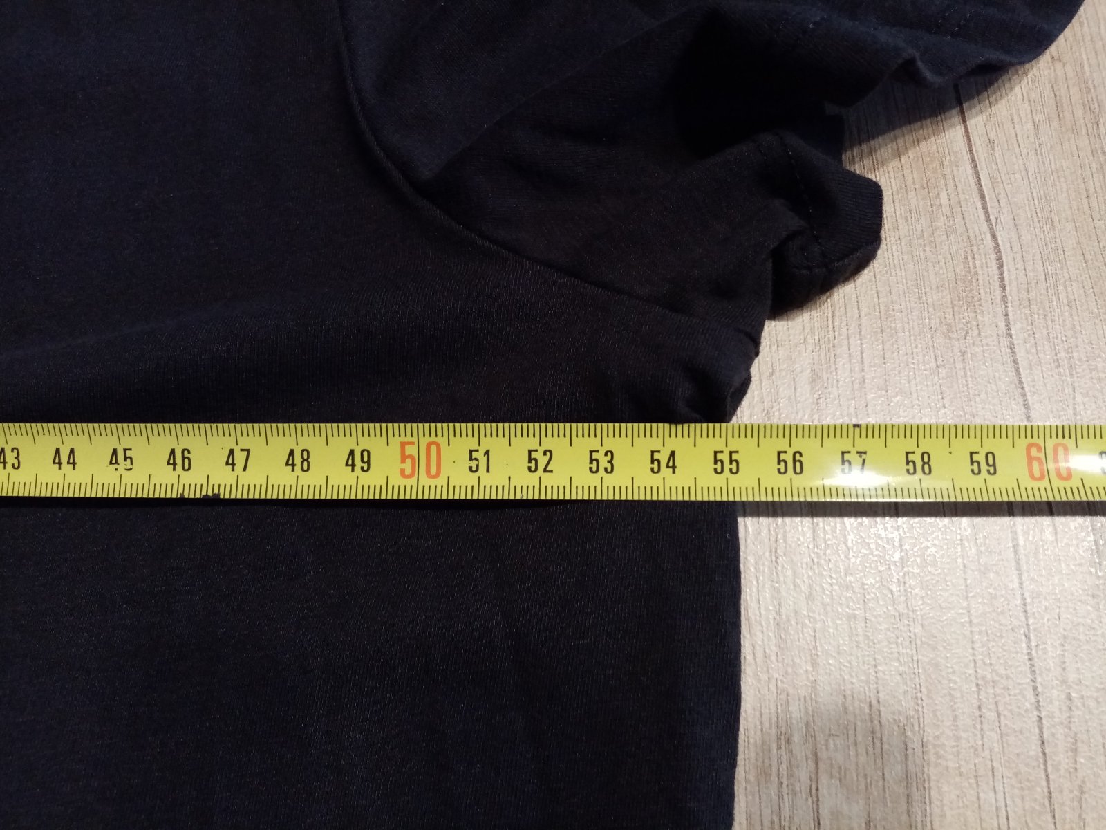 Sytě černé, krátce nošené triko, vpředu potisk bez vad, na ramenou lampasy, dole nášivka s logem, d. 77, š. 52cm