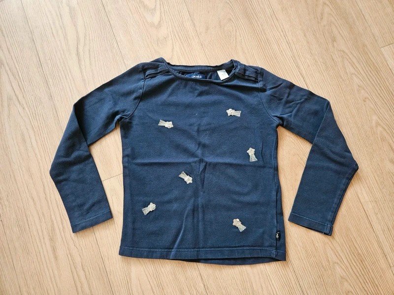Tričko s dlouhým rukávem, značka Okaïdi, má na sobě malé zlaté kometky, nošené ale bez vady