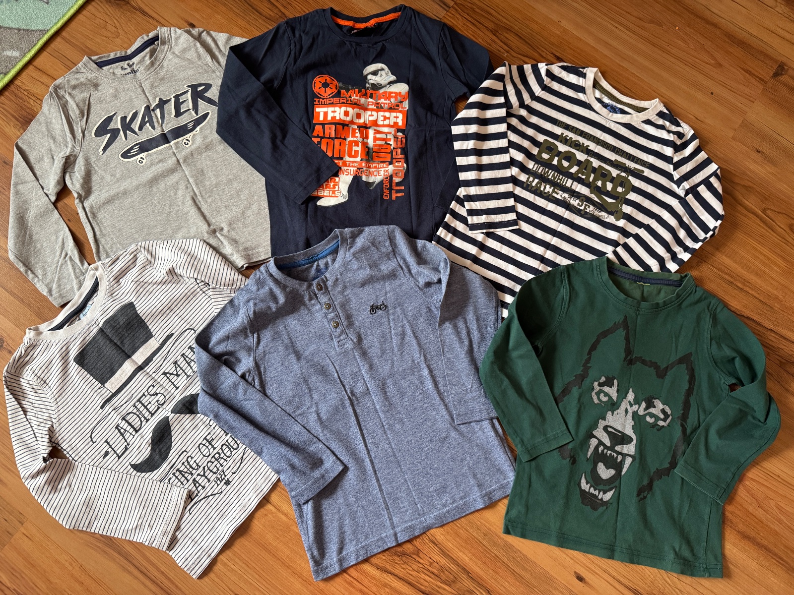 Hezké triko bez vad poze na rukávcích místy prací žmolík.Velikost 4/5 let.Celková délka je 44 cm