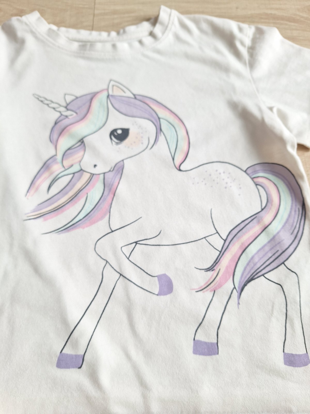 Trička H&M velikost 122-128 v krásném stavu. Světle zelinkavé s kočičkou, smetanové se zlatým motýlkem a krémové s jednorožcem. Cena 150,- kč za vše.