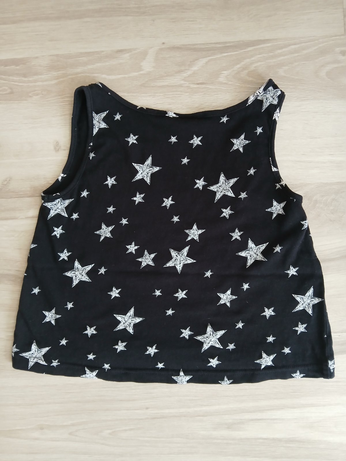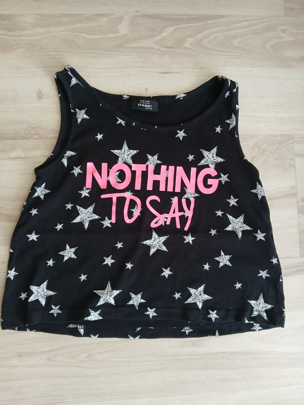 Prodám crop top vel.134/140 (8-10 let), bez vad. Délka 37,5 cm, šířka hrudníku 35 cm. Nápis fosforově růžový - nešlo vyfotit.