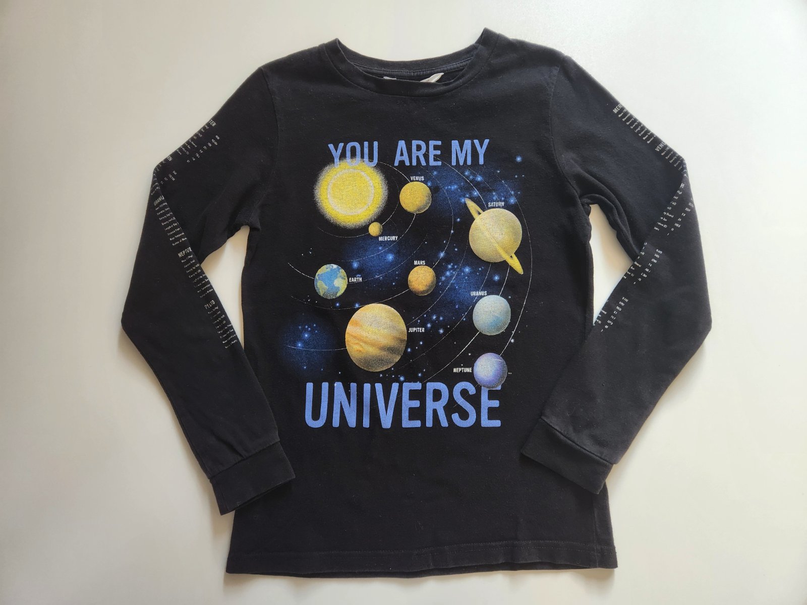 Černé triko s dlouhým rukávem zn. H&M, pružné lemy, lehce třpytivý veliký obrázkový potisk, rukávy s texty o planetách.