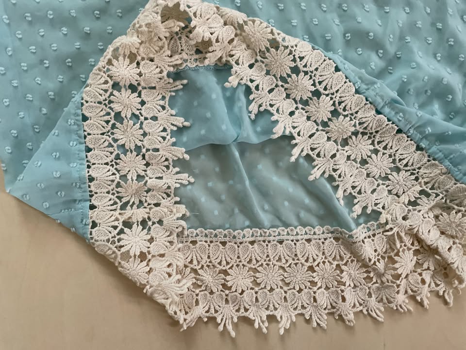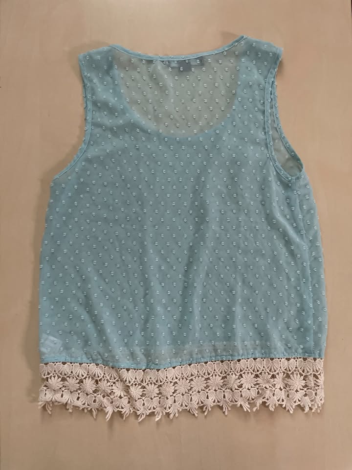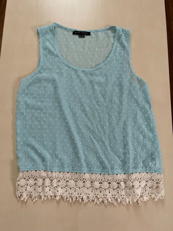 1916. nabízím k prodeji tento světle modrý letní top s krajkovým lemem, vel M, Gate woman. Materiál takový šifonový, lehce prosvítavý s plastickým vzorem. Na konci přízová krajka. 100% polyester. Nošen, bez vad, krásné
