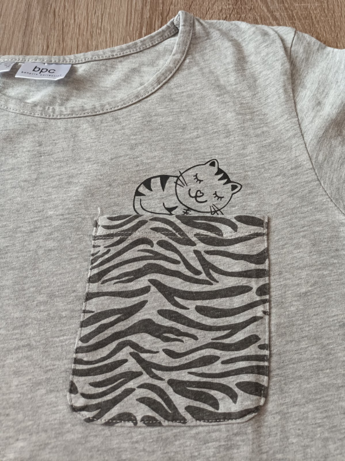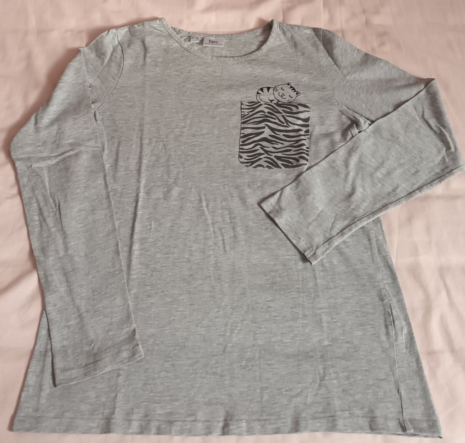 Krásné dívčí triko dlouhý rukáv světle šedé s kočičkou Bonprix, vel. 164/170. Obrázek top stav. Barva odpovídá det.fotce. Triko je nošeno svátečně, bez vad.