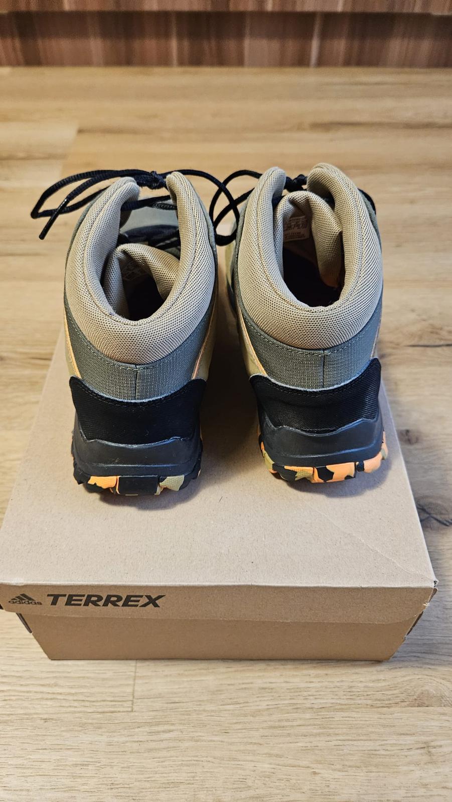 Dětské trekingové kotníkové boty Adidas Terrex Hyperhiker velikost 38 khaki zelené barvy s oranžovou.