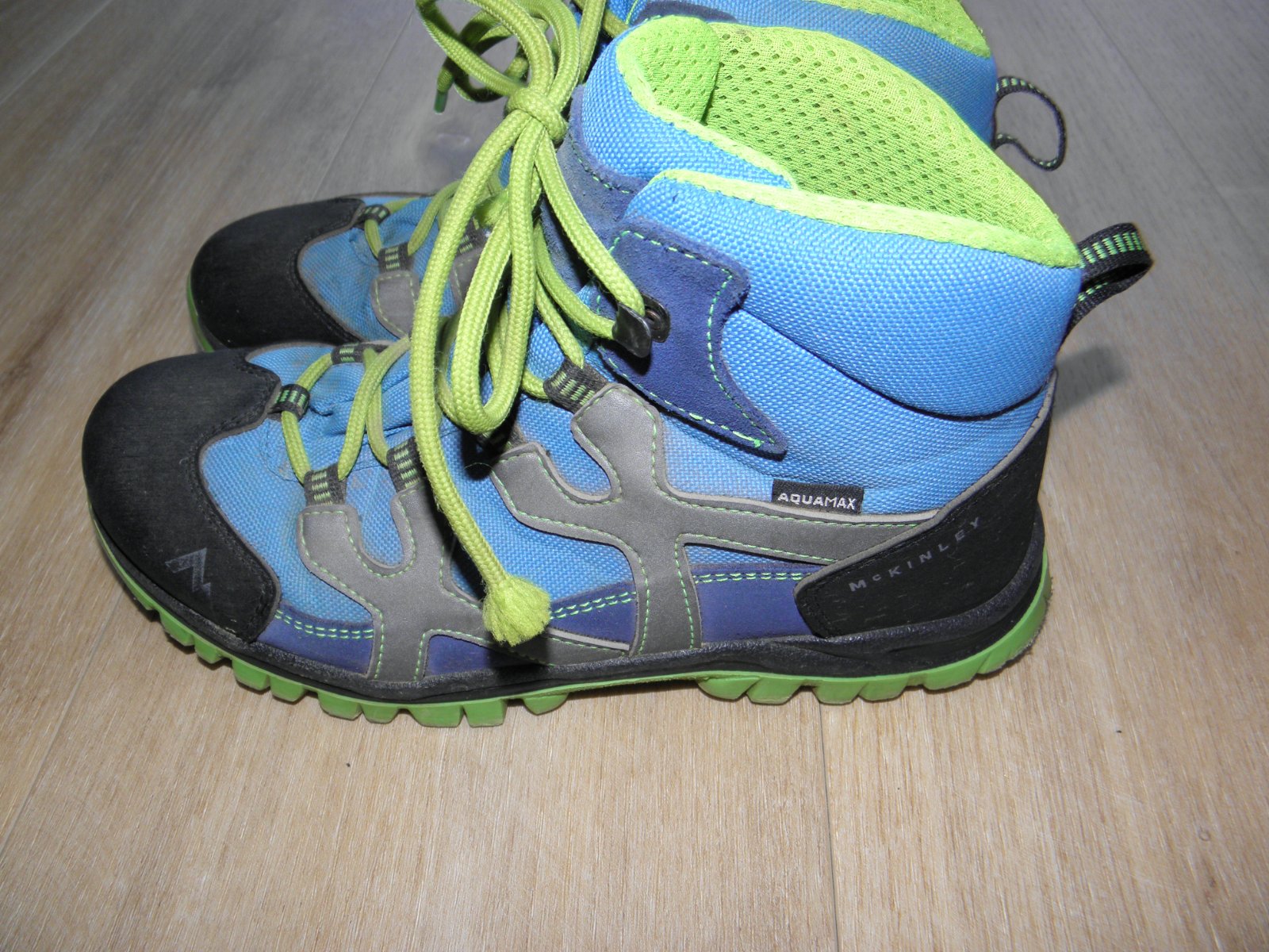 Prodám dětské trekové boty zn. McKINLEY Santiago AQX vel.37. Membrána Aquamax odpuzuje vodu, a zároveň je prodyšná vůči potu. Vyztužená pata a špička ochrání vůči vnějším nárazům. Boty byly obuty max. 10x. Mají jeden zásek o kámen na špici - viz. foto. Není to skrz, je to jen v té pevné vrstvě. Třepí se konce tkaniček, jinak jsou boty v pořádku. Děti je mají už v několikáté velikosti a jsou spokojené.