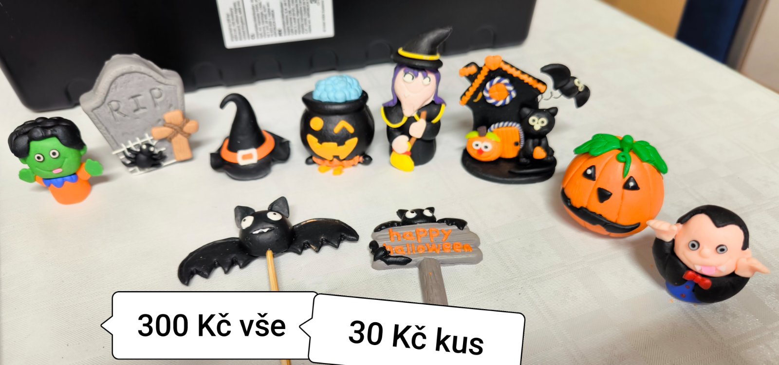 Materiál guma, tvrdší plast, převážně Fimo hmota.. takže zůstanou na výstavku nebo dětem na hraní.