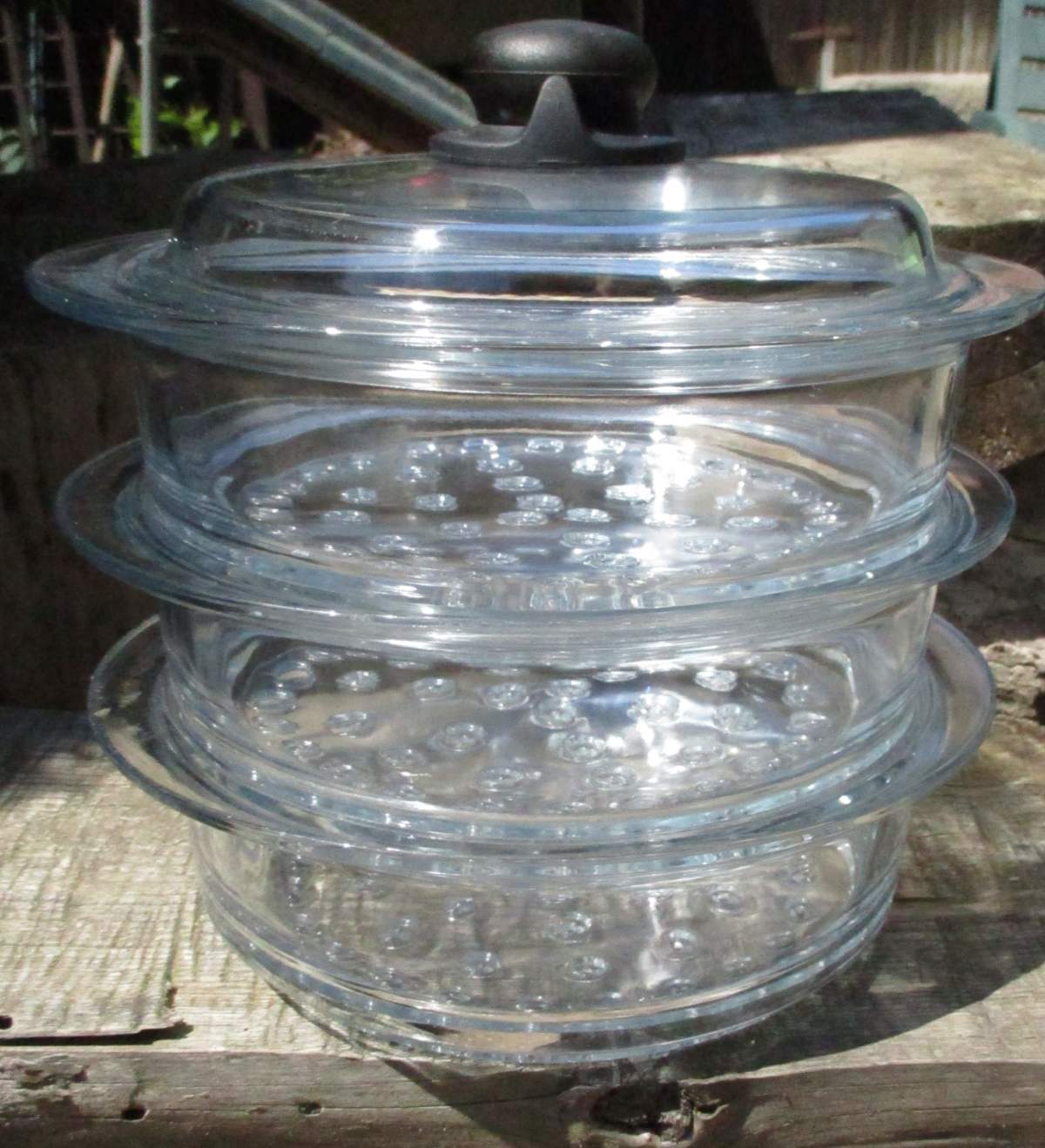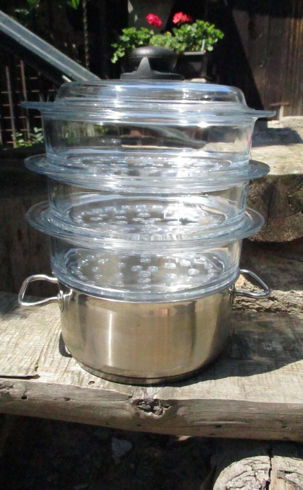 Prodám set na vaření v páře, 3x vložka + 1x poklice. Materiál sklo. Vhodné na hrnce o průměru 20 cm. Rozměr nástavců: vnitřní průměr 20 cm x výška 7 cm. Na některých místech odštíplé sklo, jinak bez vad. Používané krátce, fungují dobře, jídlo je chutné (lze vařit maso, zeleninu, vajíčka...). Celková výška včetně poklice cca 24 cm. Možnost zaslání Balíkovnou za 75.