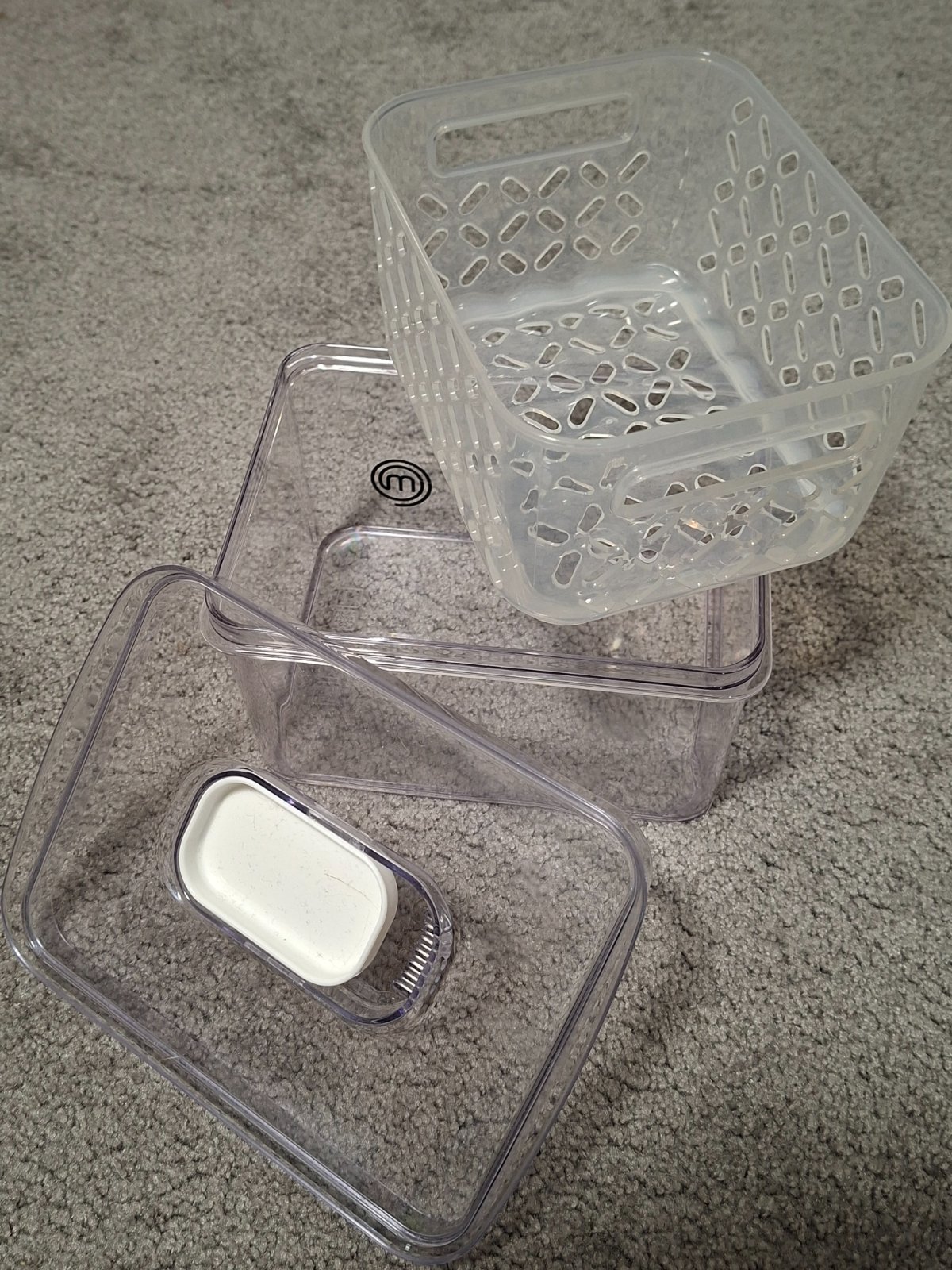 Dóza na salát- asi taky jen jednou použita, dospod se nalije trochu vody a salát zůstane v lednici déle čerstvý, obsah cá 1l. - kapku víc