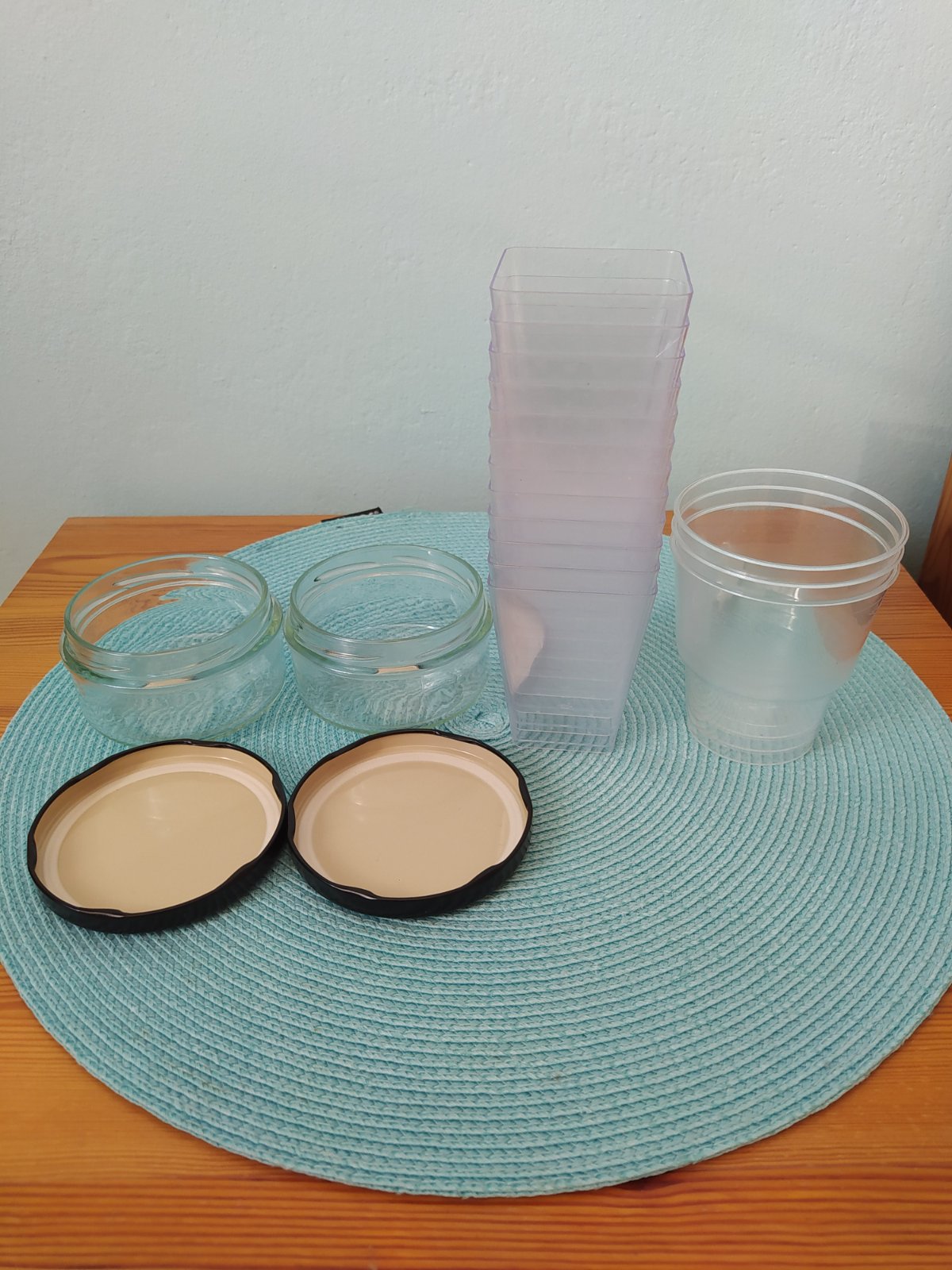 Plastové mističky na dezerty, jeden má malý záprask, není ale skrz + Dvě skleničky. Cena je za vše.