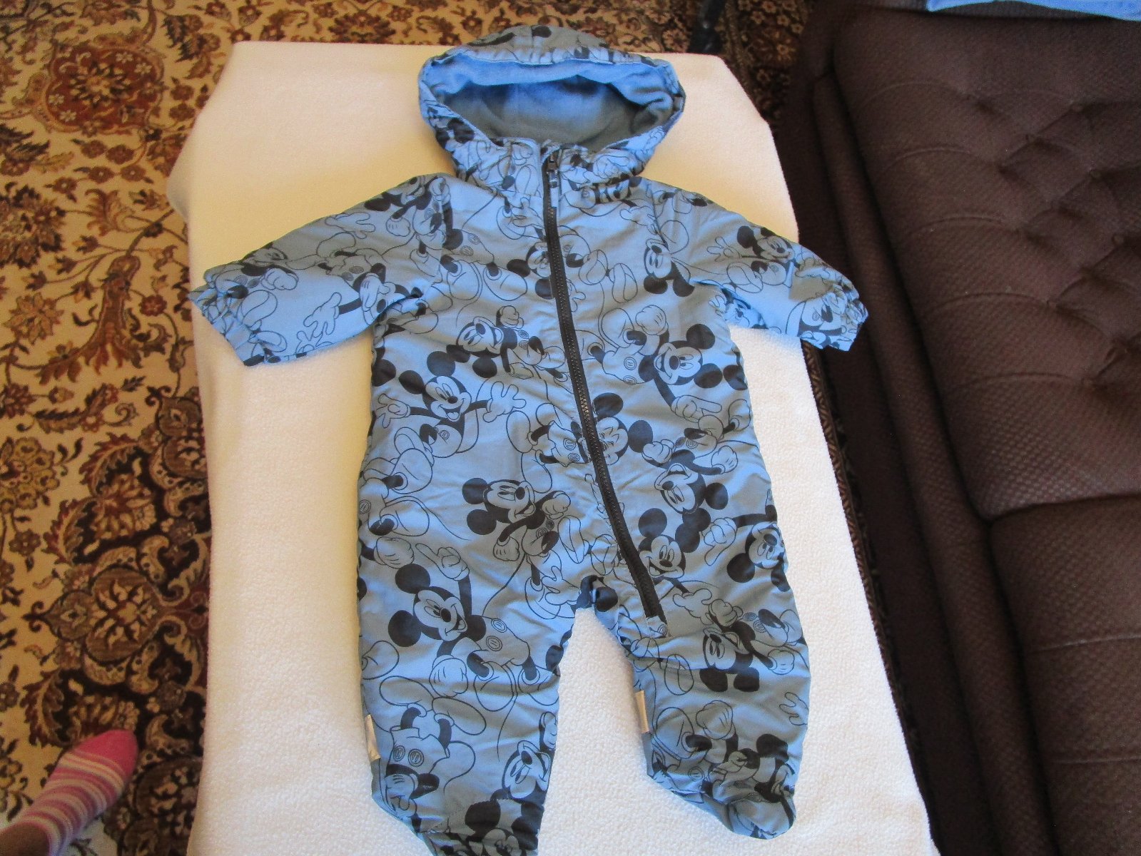 Velmi pěkná modrá zimní kombinéza s Mickey Mousem, s kapucí, zapínání na zip, ochrana brady, uvnitř flaušová, vel. 74, jako nová, cena jen 129 Kč, zn. Disney Baby.