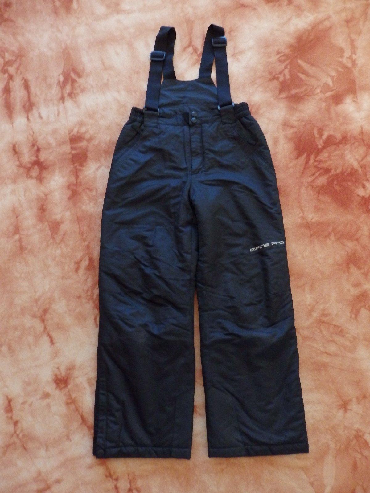 Pěkné černé oteplováky Alpine Pro, bohužel velikost 140/146 neodpovídá, jsou menší, takže jsme nosili jen jako 140. Možná by se daly už jako 134, prosím měřte. Dvě kapsičky na zip, v pase zip, dva patentky (horní moc nedrží) a k tomu ještě vedle patentků suchý zip, což je super. Pas 2x32 cm, při natažení až 2x36 cm. V nohavicích manžeta proti sněhu, vnější část nohavice se dá rozepnout pomocí zipu a patentku. V pěkném stavu.