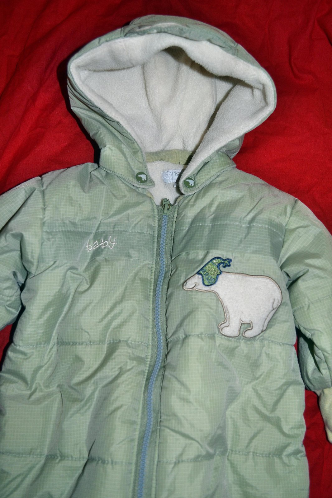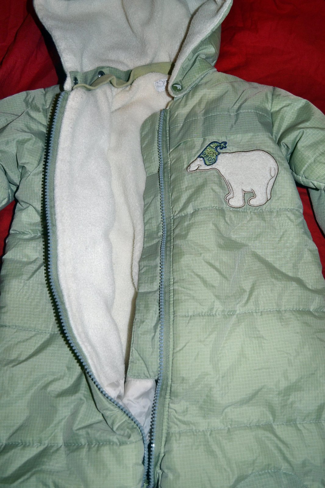 kvalitní vkusná zimní kombinéza na 9/12 měs.,s medvídkem,uvnitř jemný kožíšek,rukavičky,na zip až dozadu-výborná na přebalování,velká sleva.krásná jemná zelená barva,praktická,stav výborný