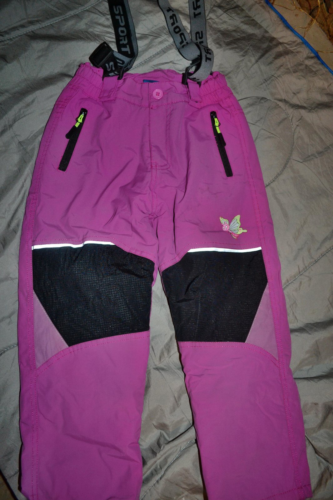 praktické ,teplé dívčí oteplovačky v.116,nastavitelné šle,vybledné,nějaký flíček, uvnitř dole v nohavicích ochrana proti sněhu a vodě,celkově v pořádku