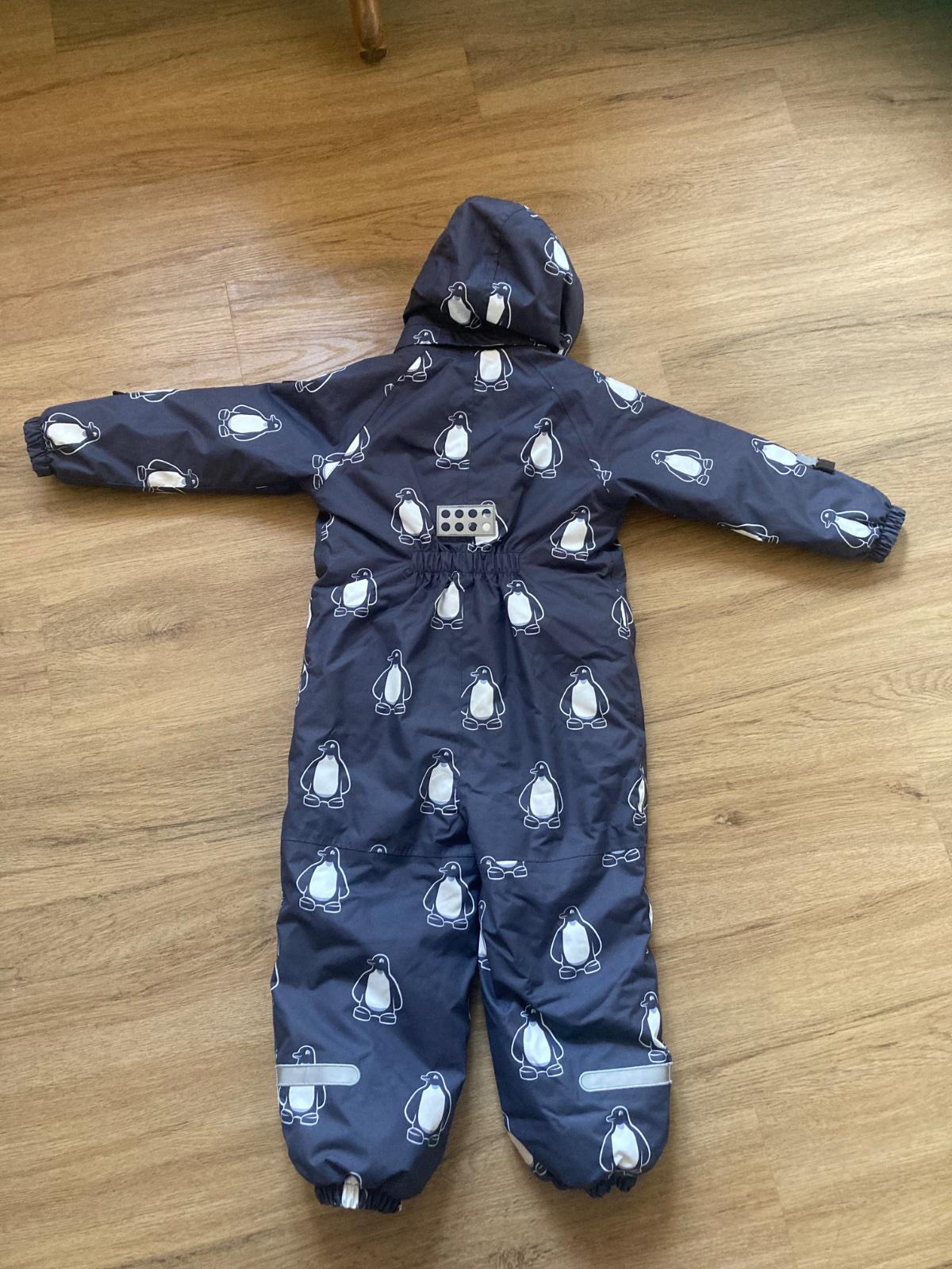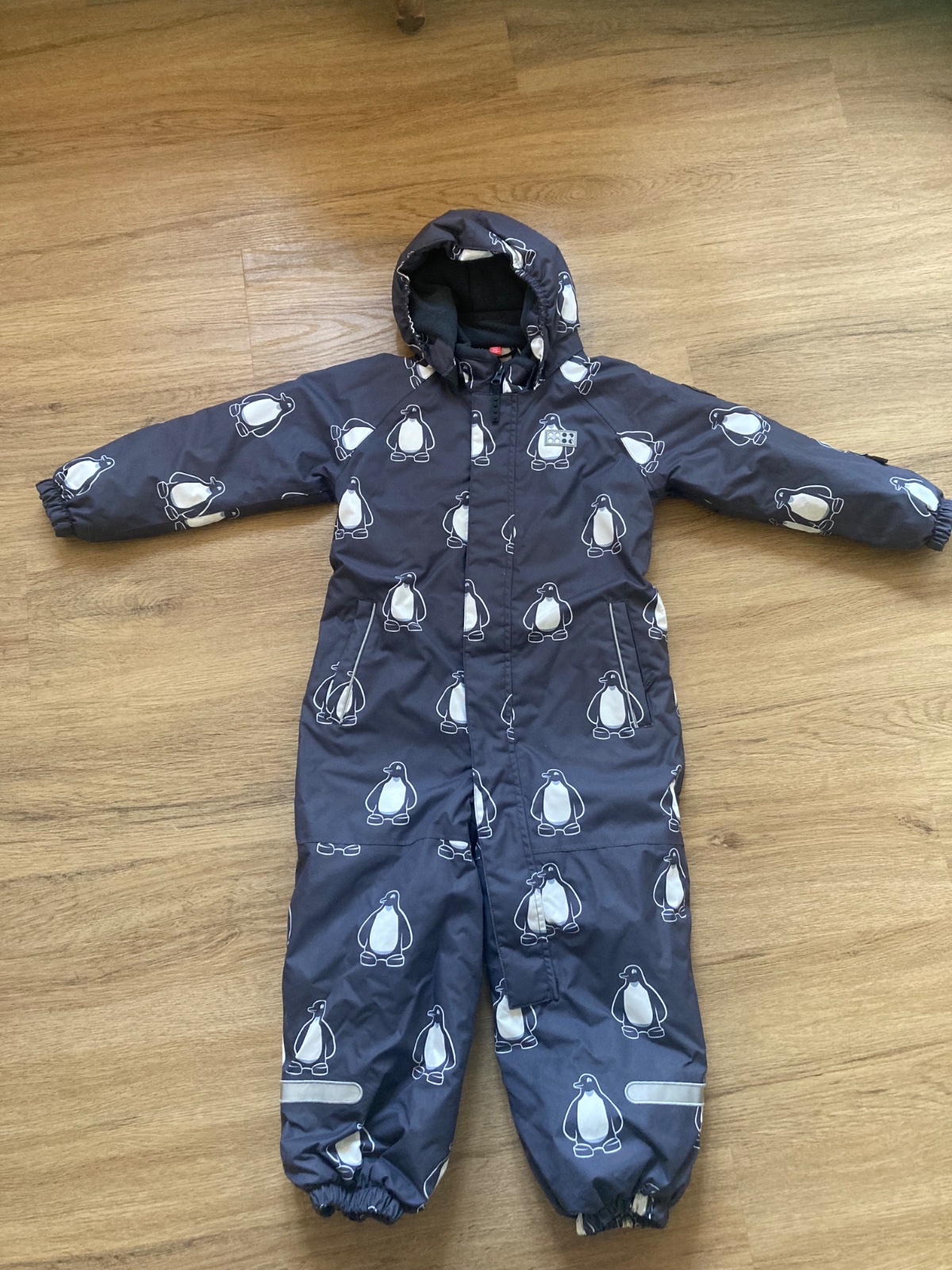 Kombinéza má malinké dírky na kolenech a zadečku, viz foto. Kapuce je odepínací, ale chybí jezdec. Možné nosit bez kapuce. Zohledněno v ceně. Jinak v pořádku. Velikost označena 91. Vhodné na chalu...
