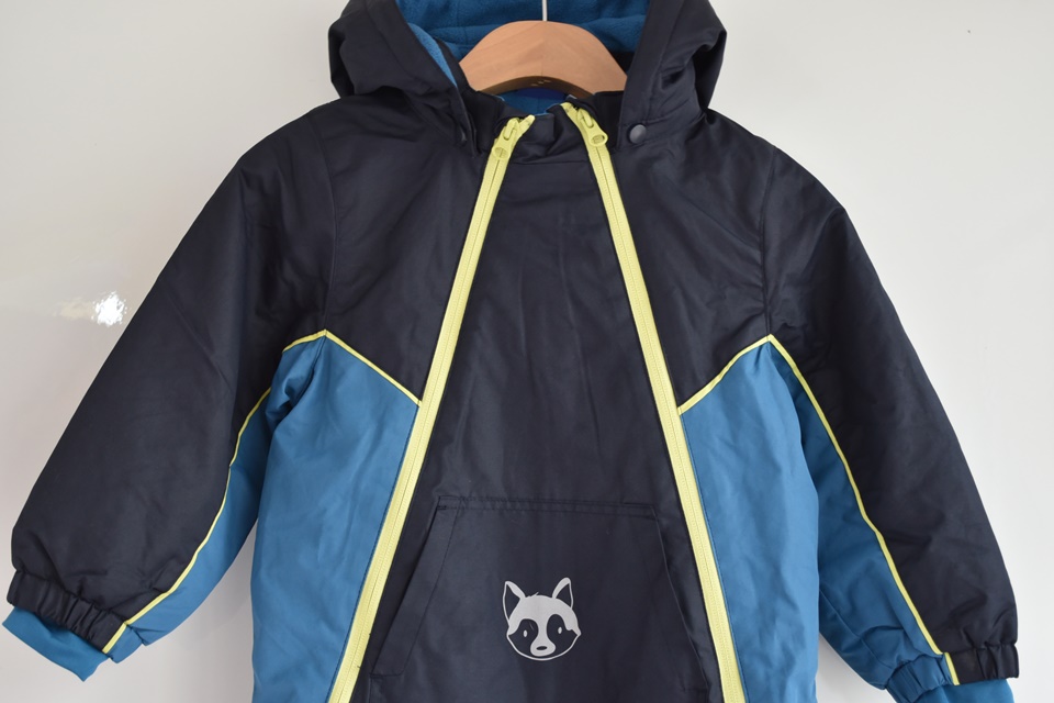 Tm. modrá kombinéza. Podšitá flees + podšívka. Kapuce jde odepnout.