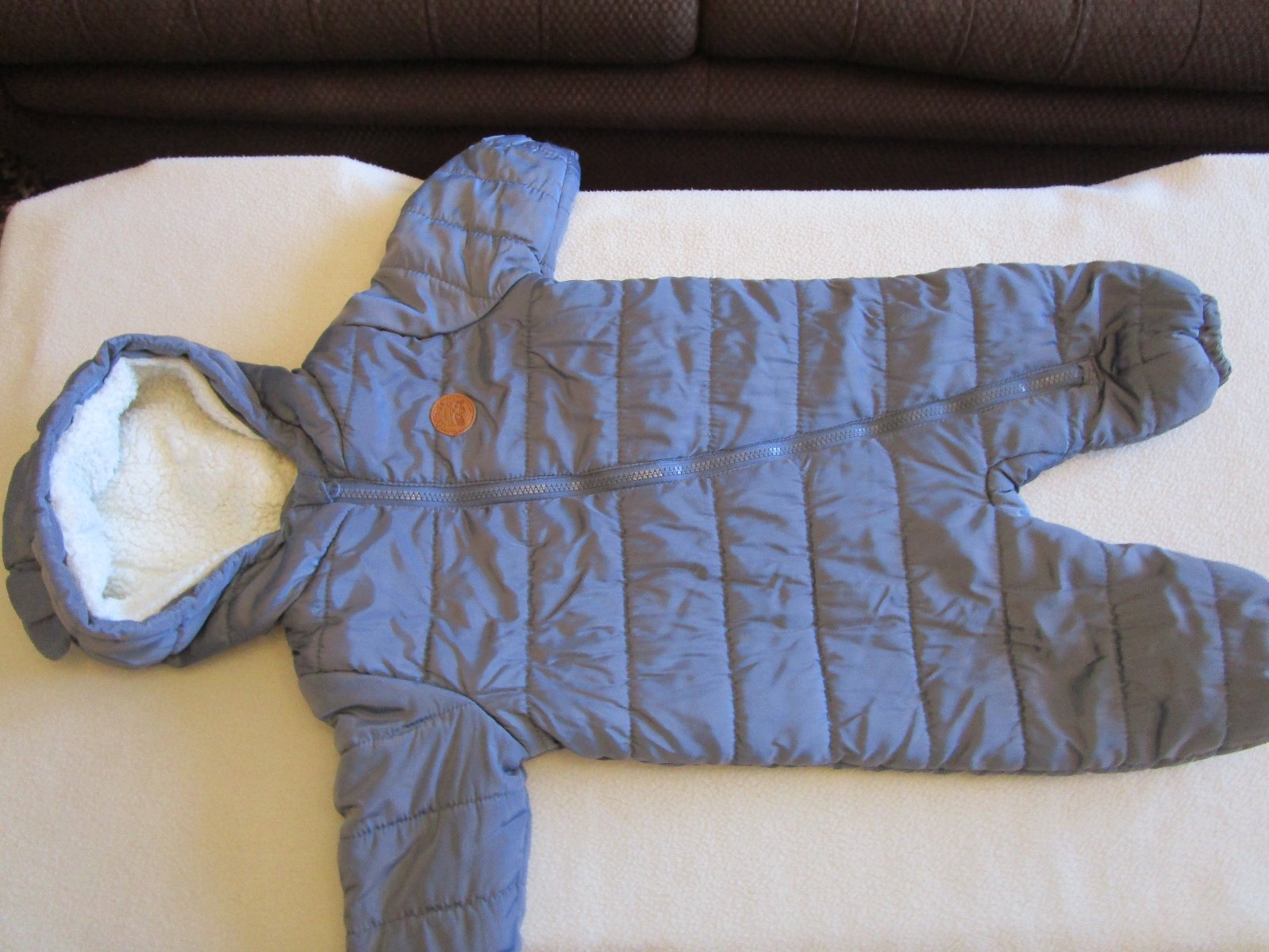 Pěkná šedá zimní kombinéza s kapucí, uvnitř kožíšek, zapínání na zip až dolů, ochrana brady, jako nová, vel. 80, cena jen 99 Kč.