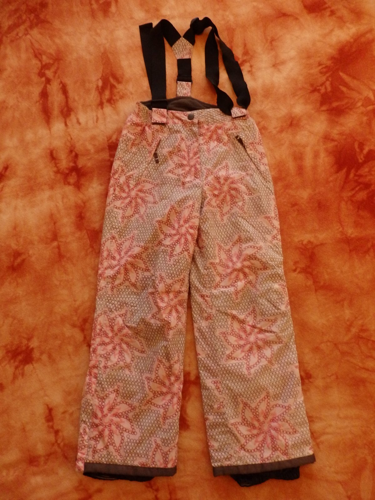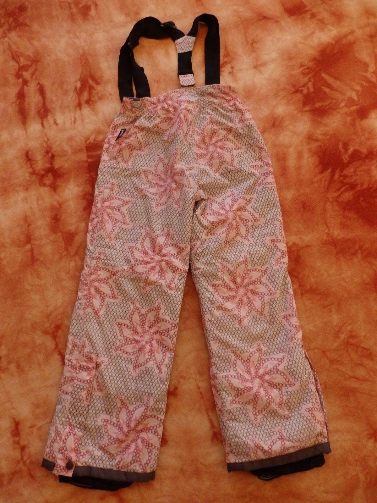 Pěkné světle růžové oteplováky s motivem osmiúhelníků a kytiček, námi velmi oblíbené, teploučké, dvě kapsy na zip, v pase zip a zasouvací knoflík. Nohavice opatřené manžetami proti sněhu, dají se rozepnout. Bohužel přesky na kšandách už odešly, vlevo chybí jedna u pasu, vpravo je poškozená přeska na úpravu délky ramenního popruhu. Jinak dobrý stav.