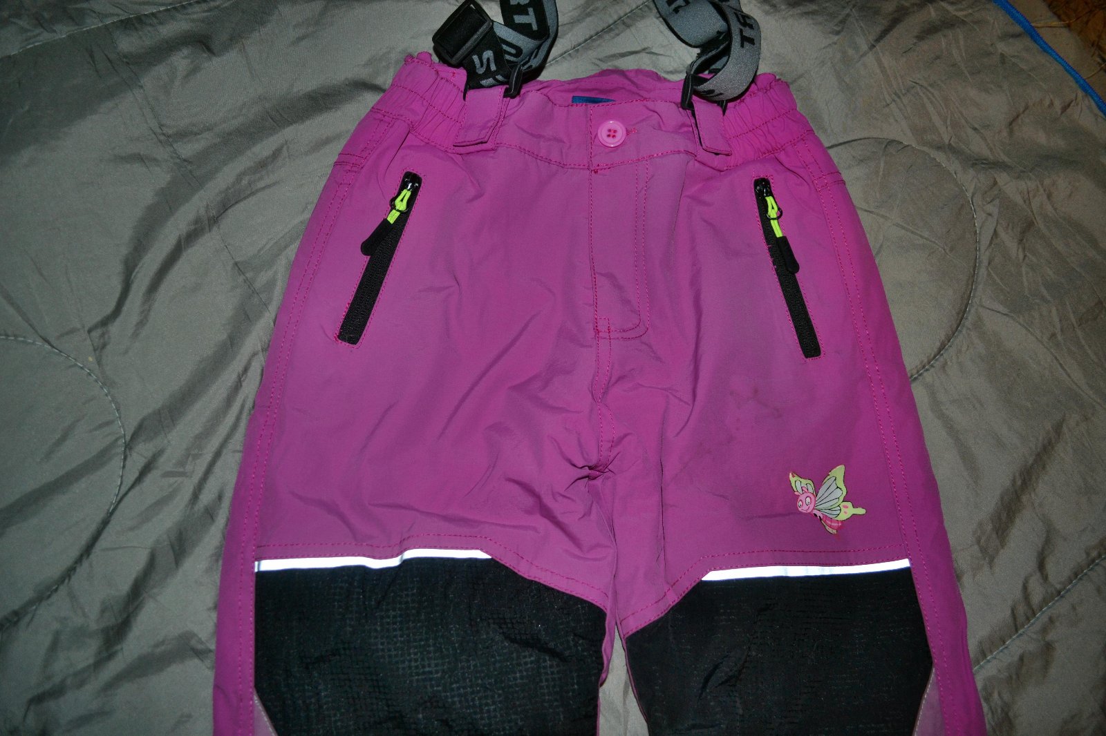 praktické ,teplé dívčí oteplovačky v.116,nastavitelné šle,vybledné,nějaký flíček, uvnitř dole v nohavicích ochrana proti sněhu a vodě,celkově v pořádku