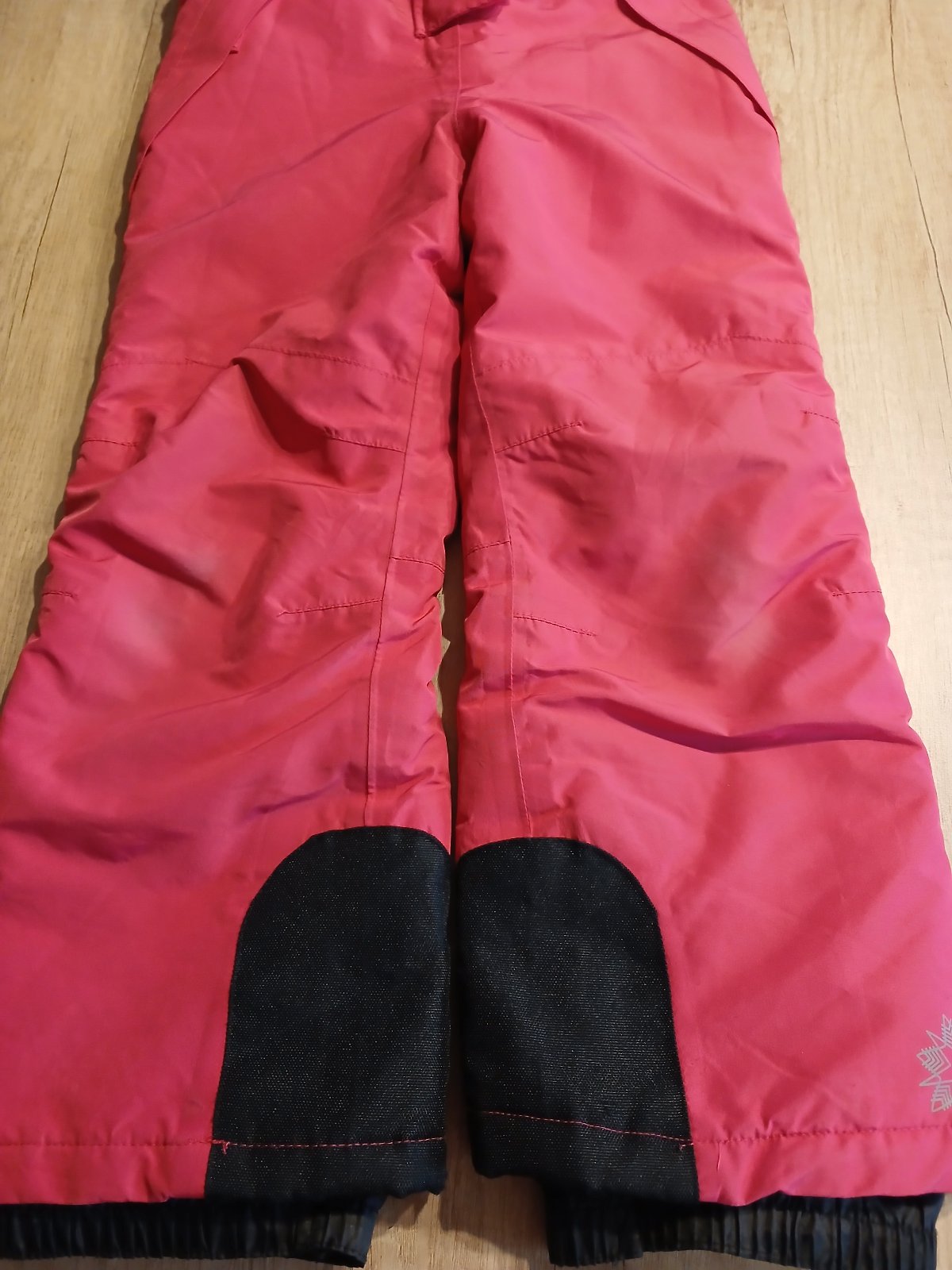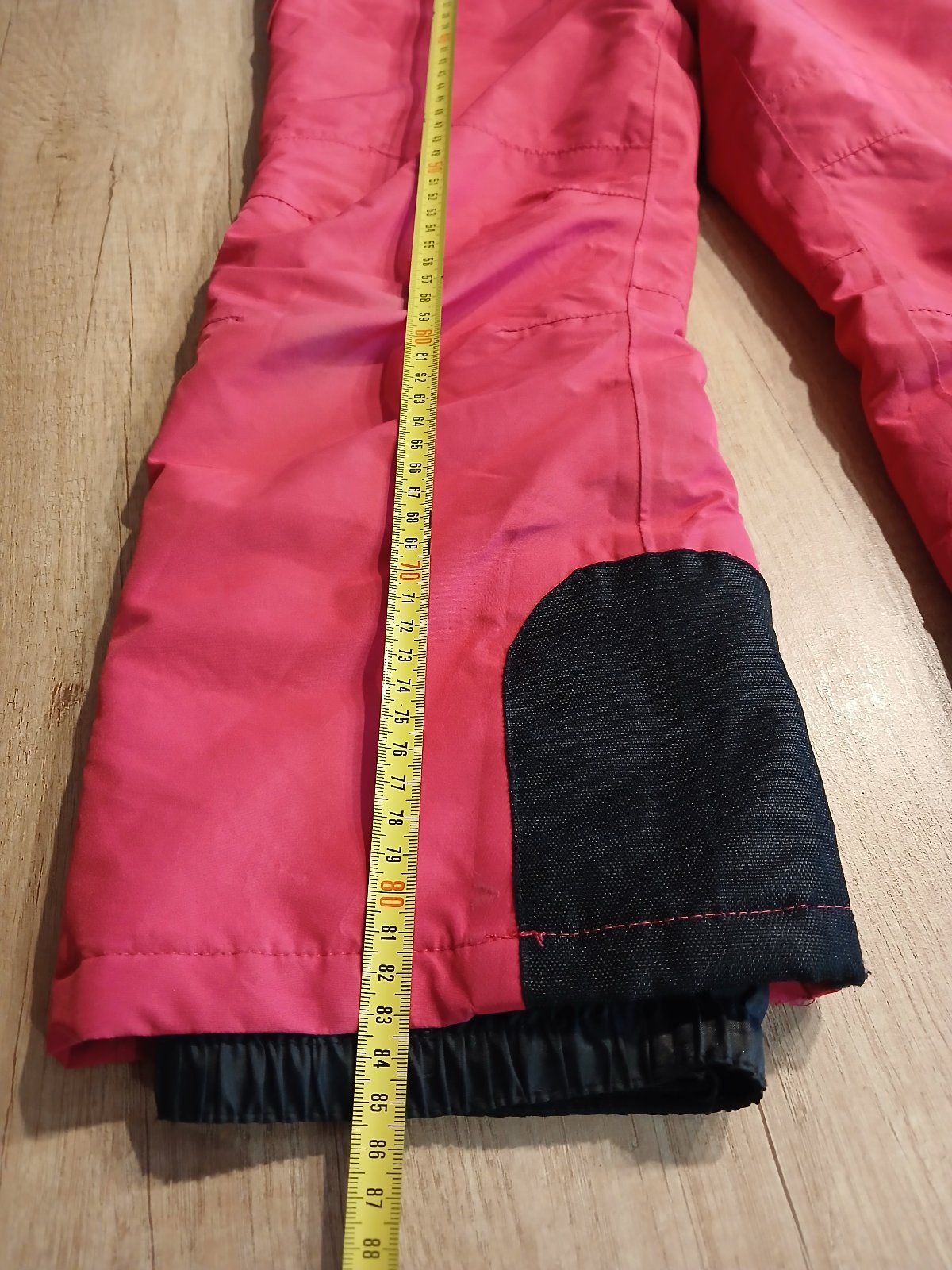 praktické ,teplé dívčí oteplovačky v.116,nastavitelné šle,vybledné,nějaký flíček, uvnitř dole v nohavicích ochrana proti sněhu a vodě,celkově v pořádku