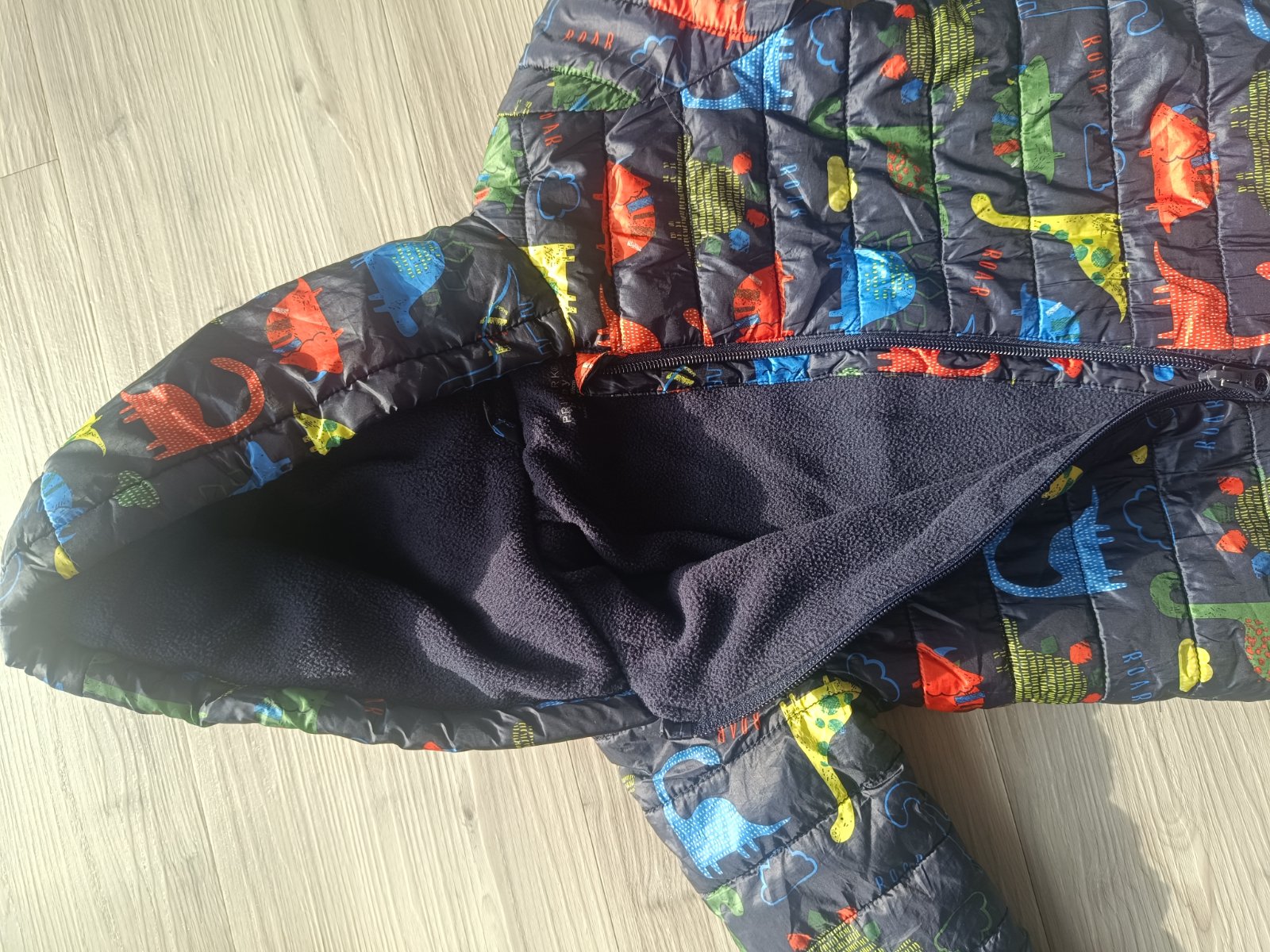 Nošená, pěkná v dobrém stavu, kapuce odnímatelná na druky, dole gumky, vel. uvedena na 12m, délka od ramene 73cm