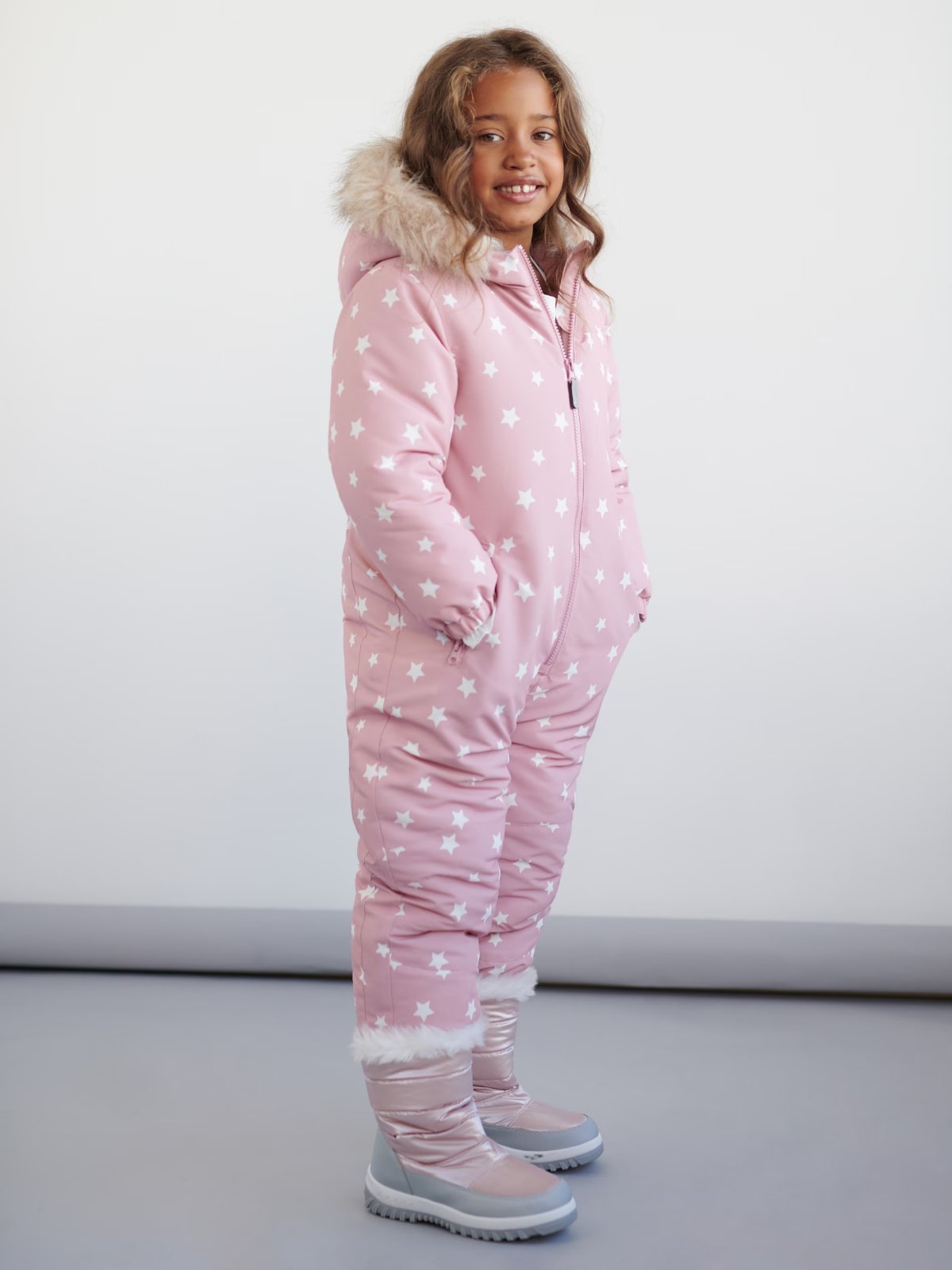 Krásná světlá holčičí zimní kombinéza s bílými hvězdičkami.