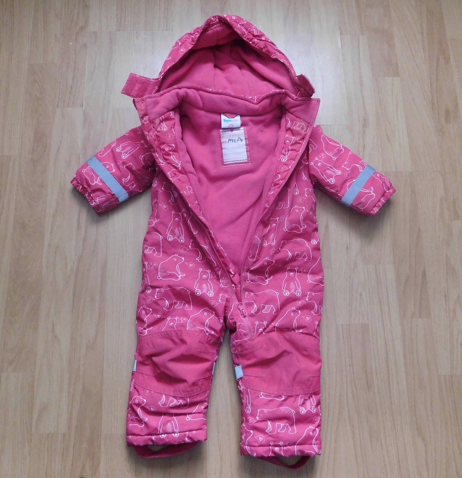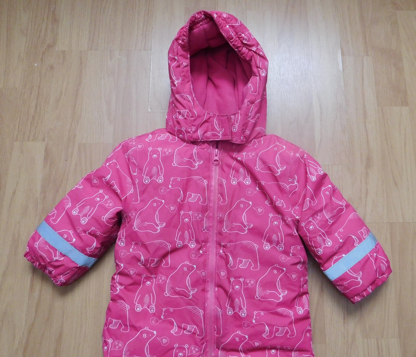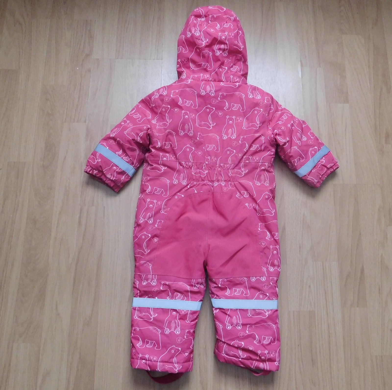 s medvídky,kapucka,uvnitř teplá flísová podšívka,zesílená kolínka a zadek,zábrany proti sněhu v nohavicích,gumky v nohavicích,reflexní prvky,d.70cm,ruk.od krku 32cm,uvnitř podepsaná